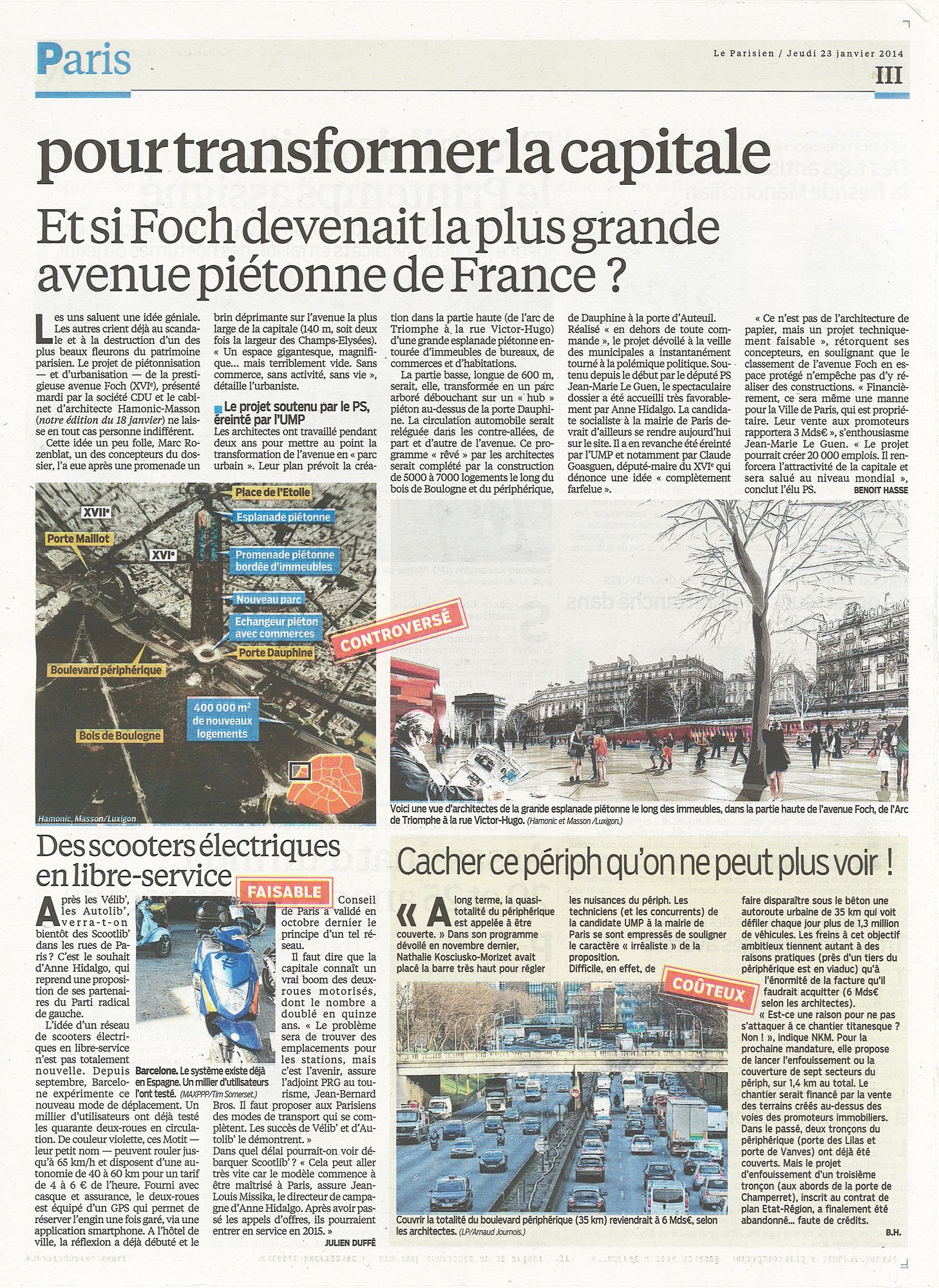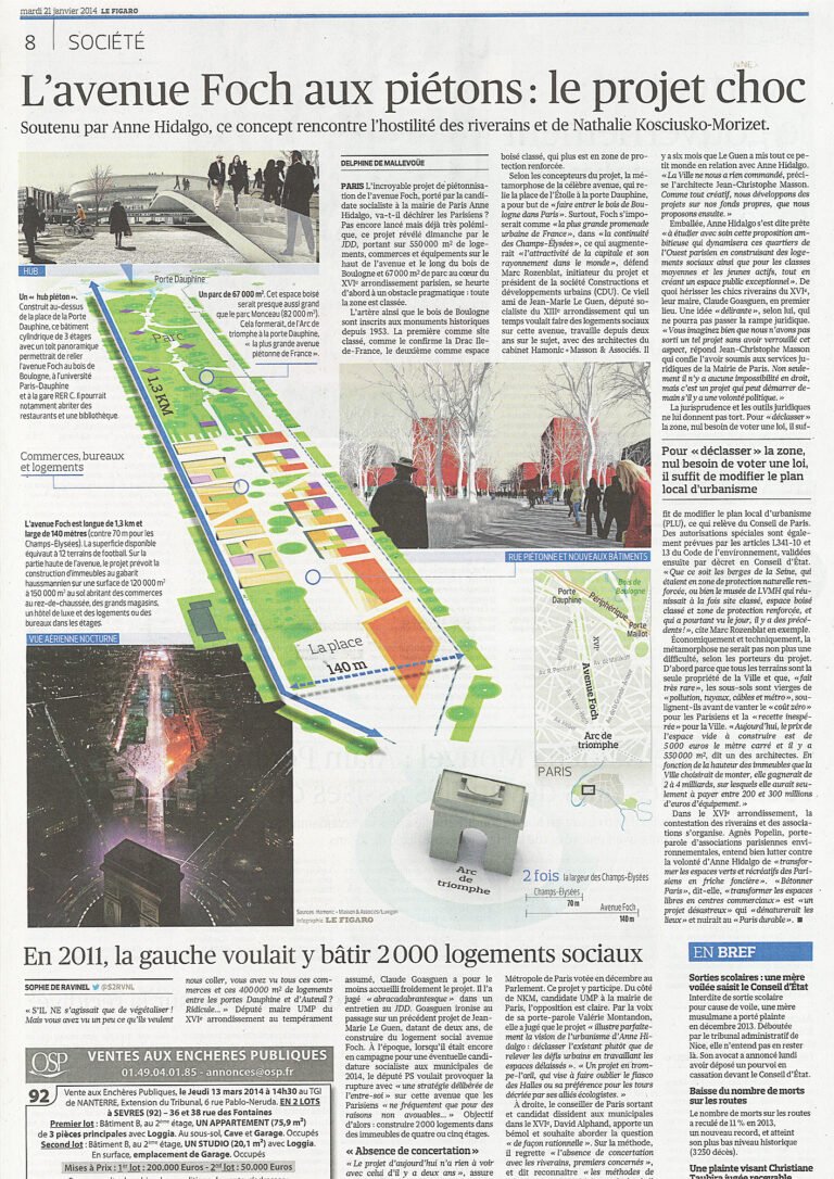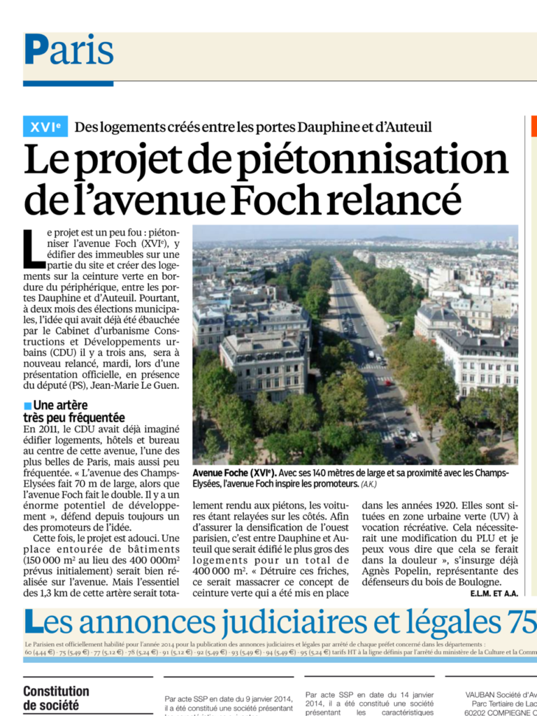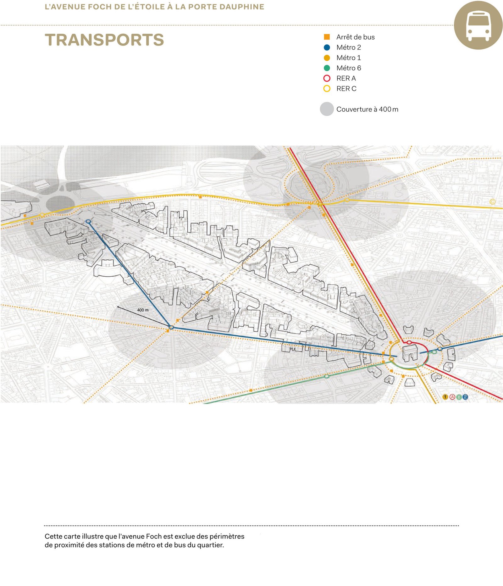 Parce que l’ignorer ne mène qu’à la reconduction d’erreurs anciennes, le regard sur l’avenir est impossible sans un regard sur le passé. Originellement, l’avenue Foch est un lien fort entre le bois de Boulogne et Paris, son prolongement naturel. Nous proposons ici de revenir à cet aspect fondateur essentiel, progressivement détourné puis perdu par l’édification du périphérique. En effet, dès 1960, la réalisation du rond-point de la porte Dauphine, dû à la présence de plus en plus importante de la voiture, porte le premier coup et contribue à la séparation physique du bois et de l’avenue, qui est définitive en 1973, quand le périphérique est édifié. L’avenue Foch, ayant jusqu’ici le statut de la plus grande promenade urbaine, devient la première autoroute intra muros. Elle brille aujourd’hui par les absences qu’elle met en scène. Absence d’activités, absence de vie tout simplement. Convoquer l’histoire nous permet de comprendre les strates urbaines, les éléments fondamentaux et les moments de ruptures qui ont contribué à la perte de l’essence première de cette voie. Il est intéressant de constater ici que la construction du parking Étoile Foch en 1968 a totalement éventré la moitié de l’avenue. Le paysage que nous avons donc sous les yeux aujourd’hui est en fait, pour moitié, un pastiche haussmannien de la fin des années soixante. Les dossiers de classement de l’avenue Foch, rattachée au bois de Boulogne, du 23 septembre 1957 et du 18 juin 1960 n’ont donc pas empêché la construction du périphérique et du parking. La voiture et les déplacements étant décrétés cause nationale, l’État a signé les autorisations nécessaires. Aujourd’hui, le périphérique se retrouve donc en site classé ! L’histoire nous permet ainsi de constater des absurdités, mais aussi de s’appuyer sur la jurisprudence. Si la voiture a été une cause nationale dans les années soixante et soixante-dix, que dire du logement et de l’espace public en ce début de XXIe siècle ?