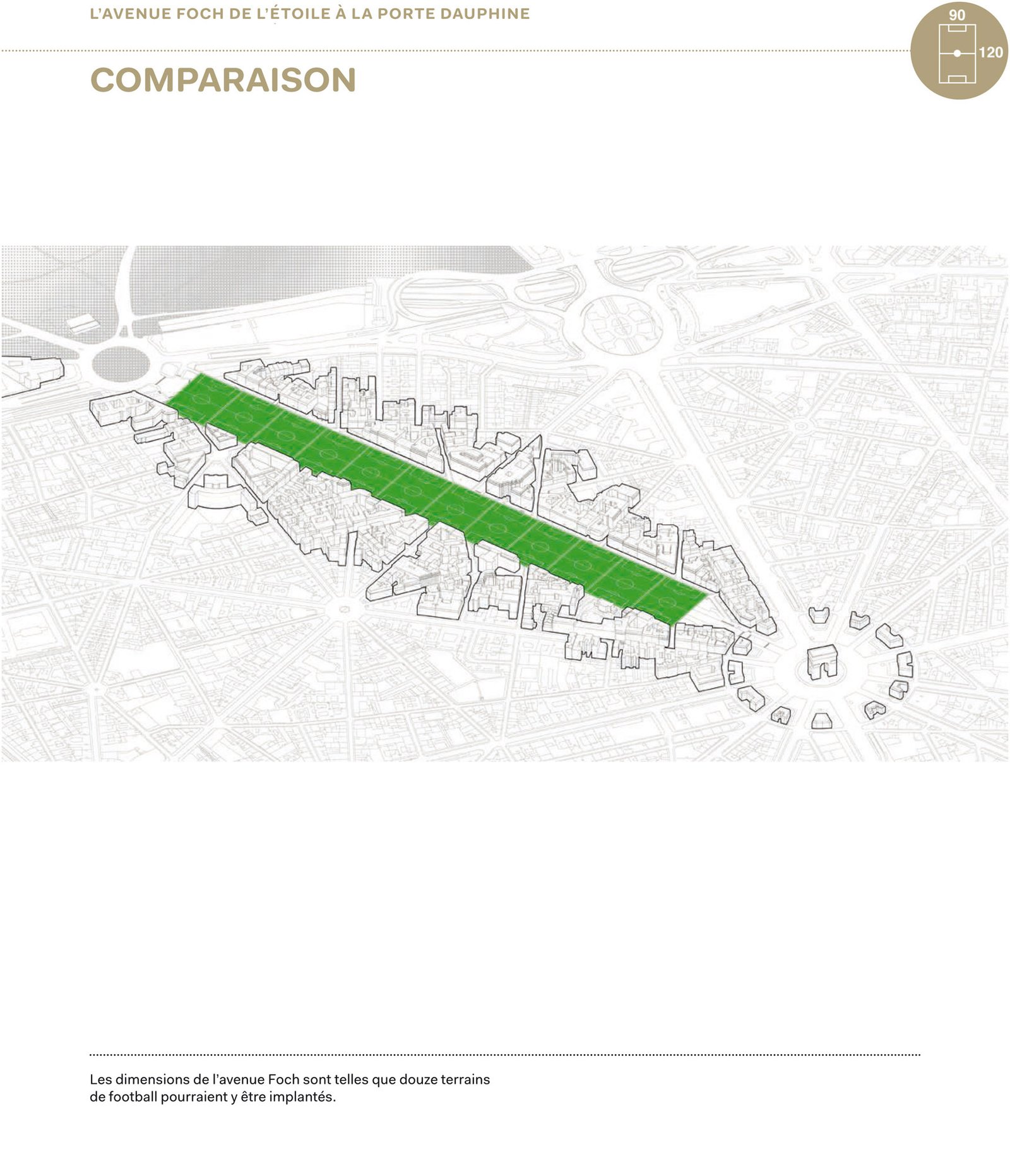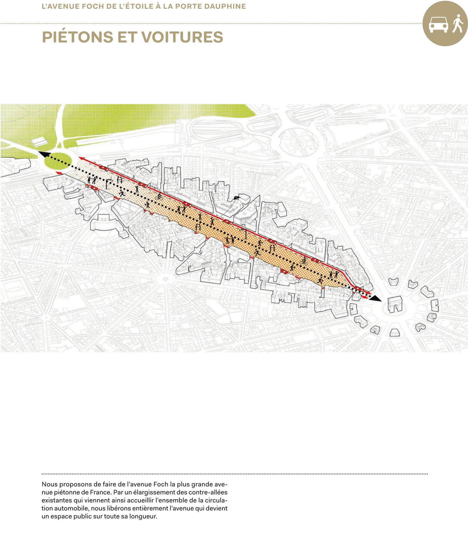 Pour cela, nous proposons de faire de l’avenue Foch la plus grande avenue piétonne de France. Par un élargissement des contre-allées existantes qui viendraient ainsi accueillir l’ensemble de la circulation automobile, nous libérons entièrement l’avenue qui devient, sur toute sa longueur, un espace public. Les voitures repoussées en marge, nous pouvons alors faire pénétrer le bois de Boulogne dans Paris, en installant un véritable parc sur la moitié de l’avenue. On y trouverait, disséminés çà et là, des lieux représentatifs d’une vie parisienne intense et alternative. Une image de la ville plus indécise et en continuelle reprogrammation, aux contours plus flous, qui n’en demeure pas moins d’une grande inventivité et créativité. Dans sa partie est, l’avenue Foch se densifie autour d’une mixité programma.tique (grand magasin, hôtel de luxe, bureaux, commerces, logements…). Ici, nous construisons la véritable place de l’Étoile, futur lieu de rendez-vous des Parisiens comme des touristes et prolongement naturel des Champs-Élysées.