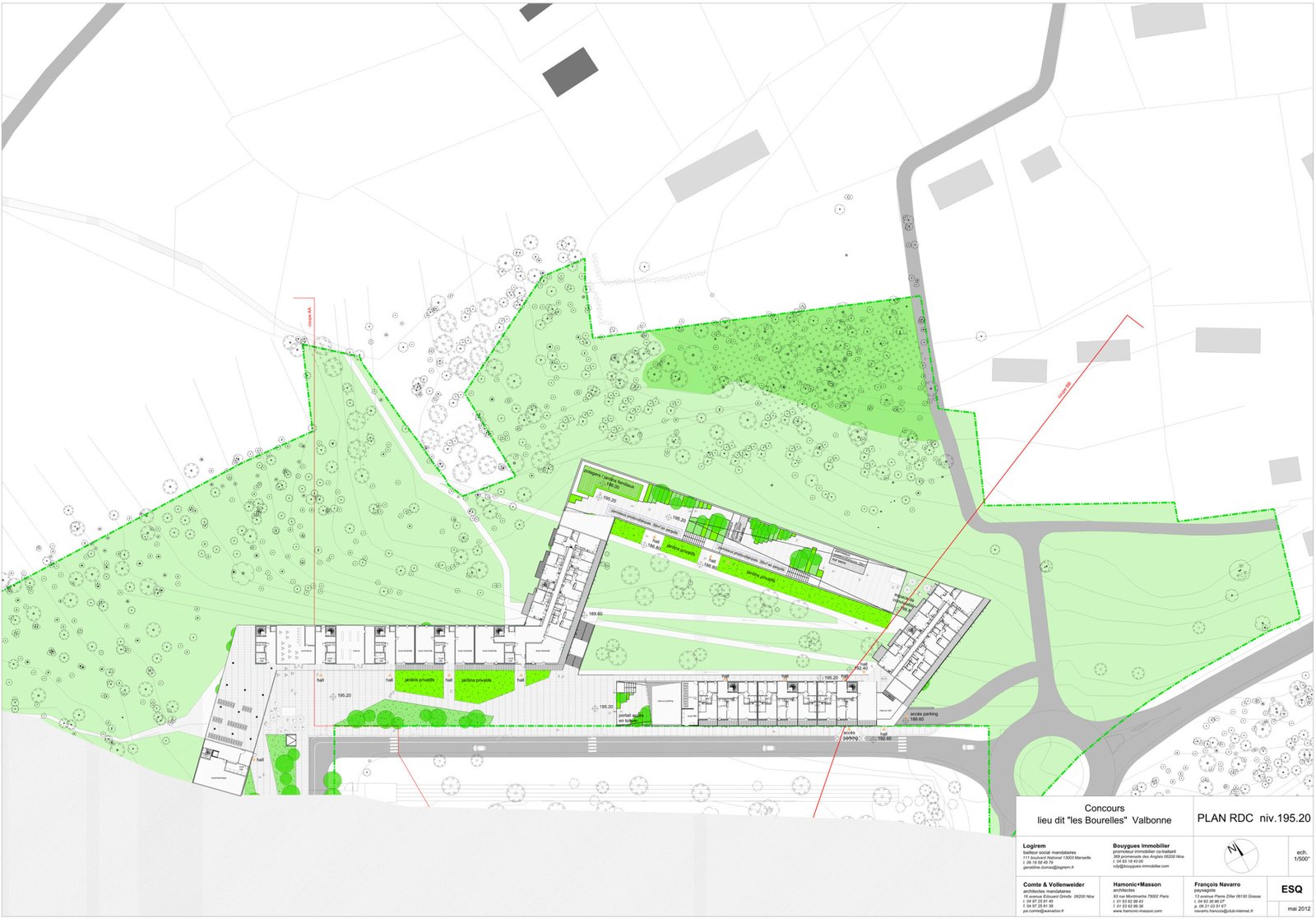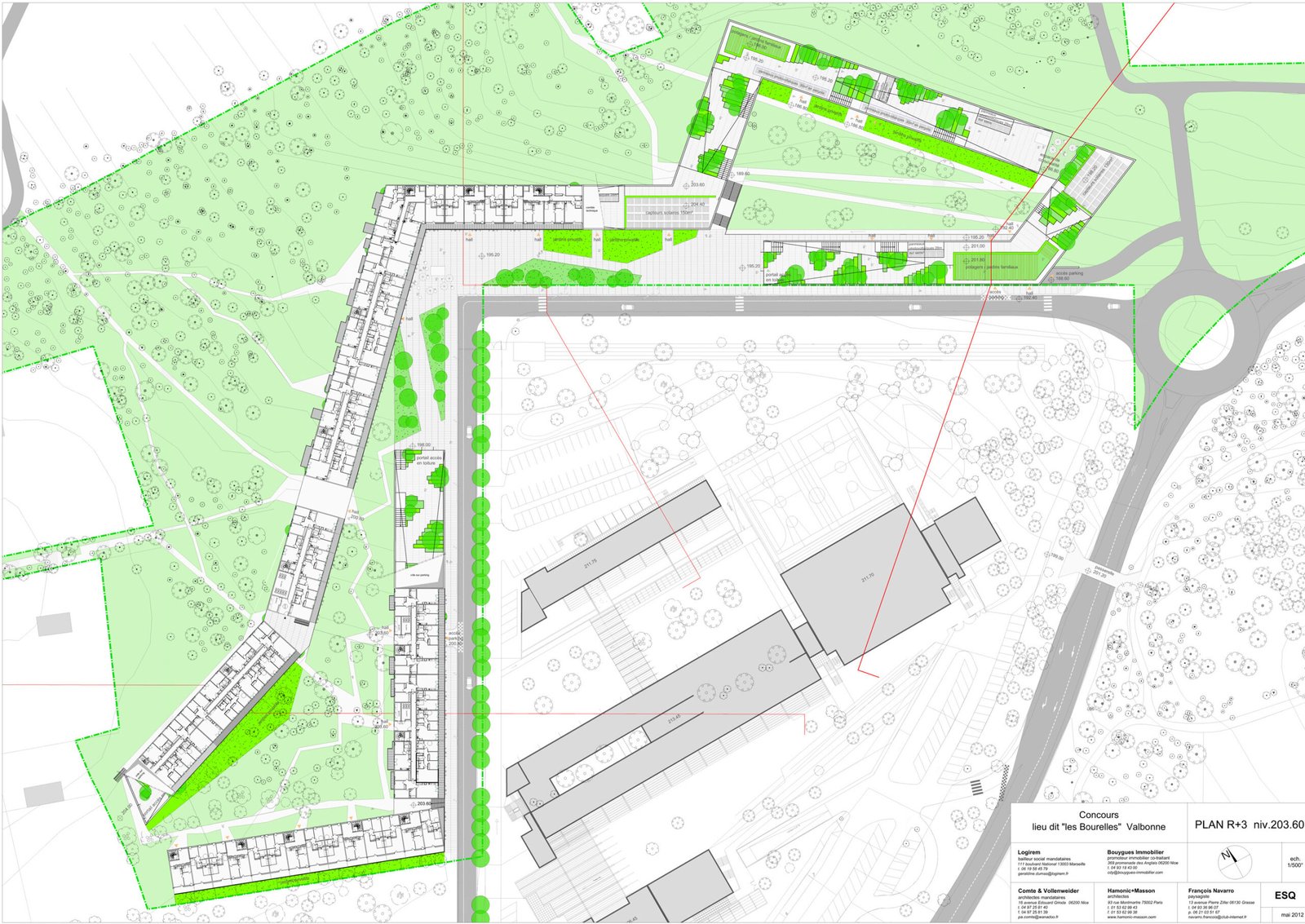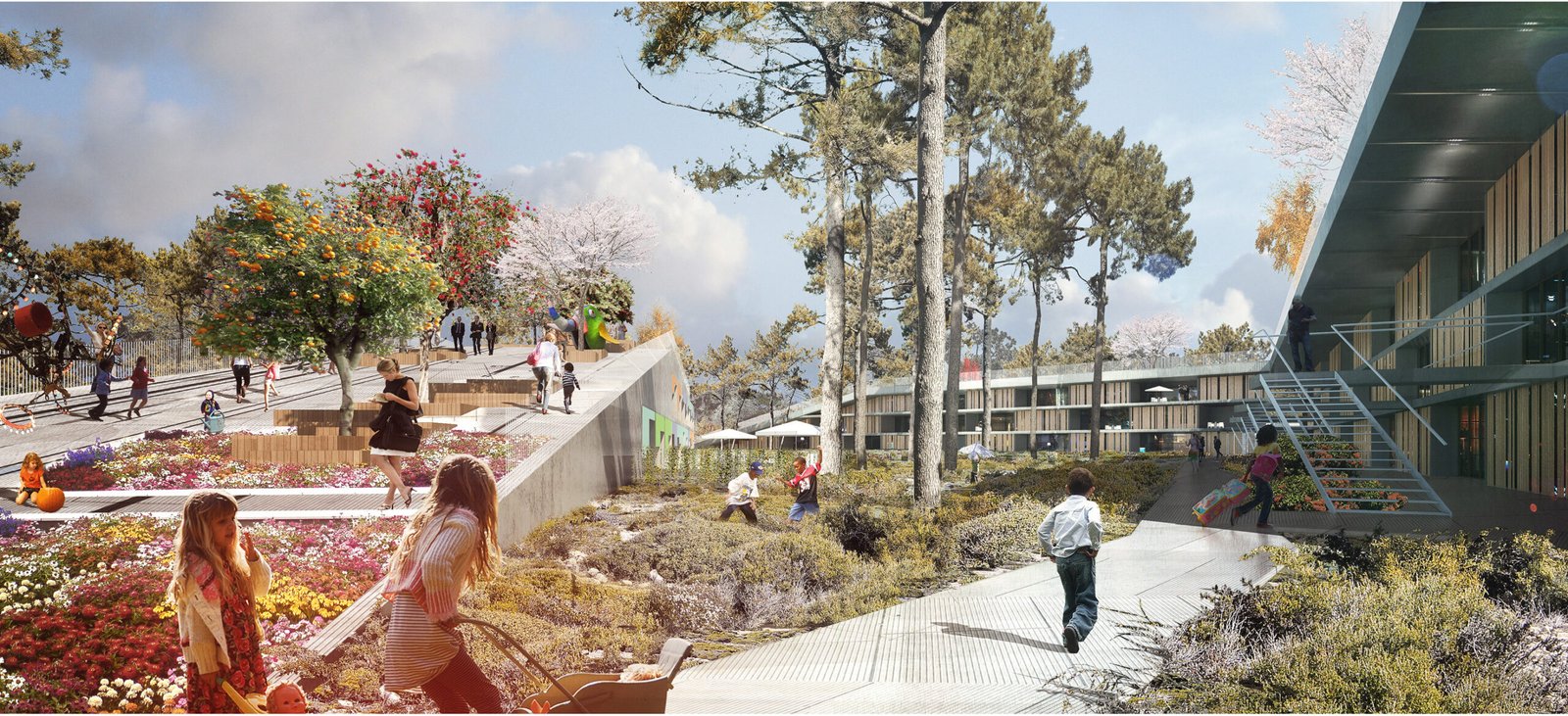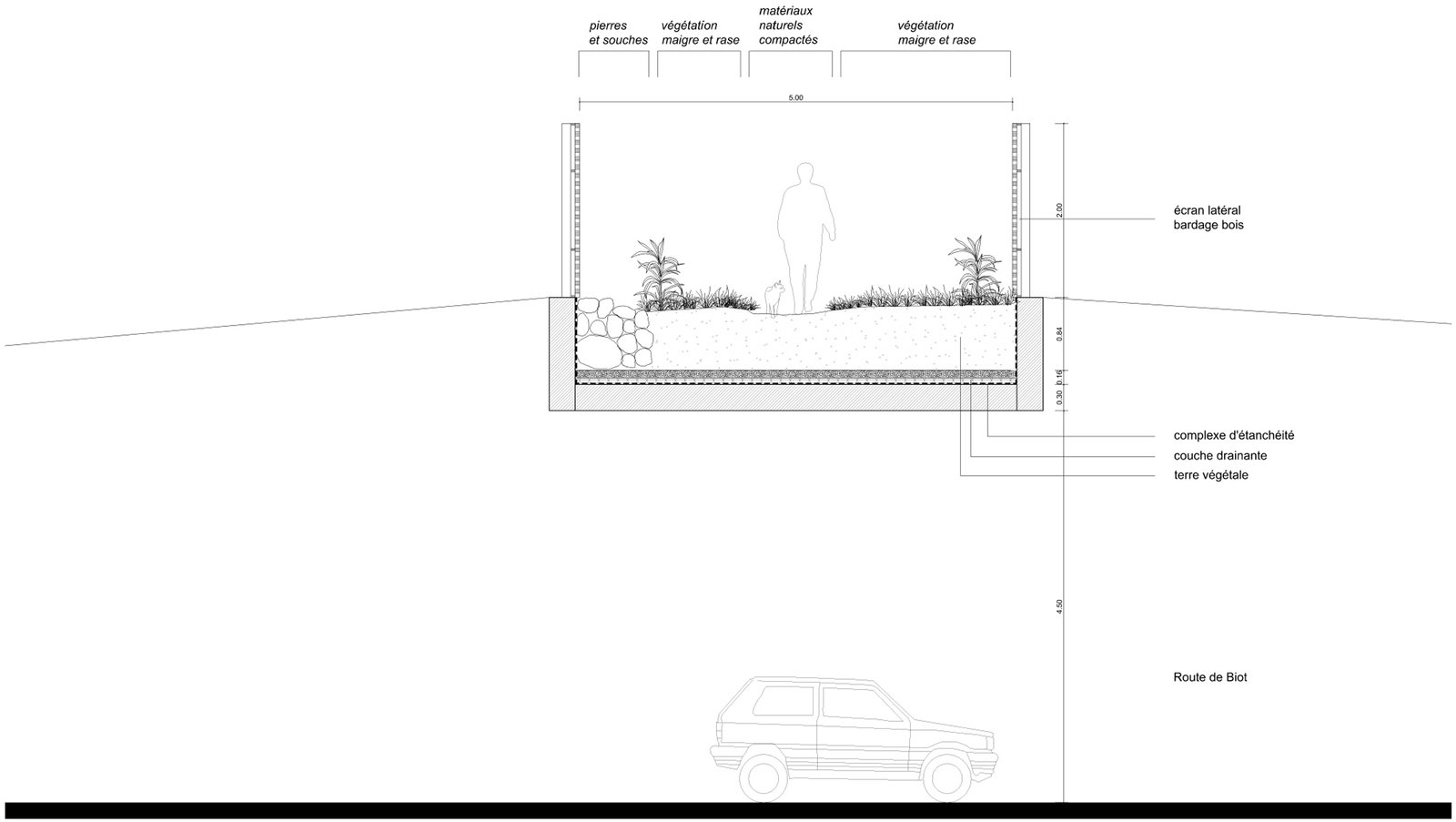 Lire la suite : Vert ToitPlacé à la convergence des déplacements doux et à l’entrée des habitations, le parvis a vocation à donner l’identité du lieu, à créer une centralité capable à terme d’accueillir des activités propres au développement de la vie de quartier et d’envisager que les élèves du lycée ou plus simplement les habitants du quartier puissent profiter d’un lieu urbain plein sud à l’écart de l’infrastructure routière de la route de Biot.