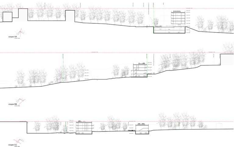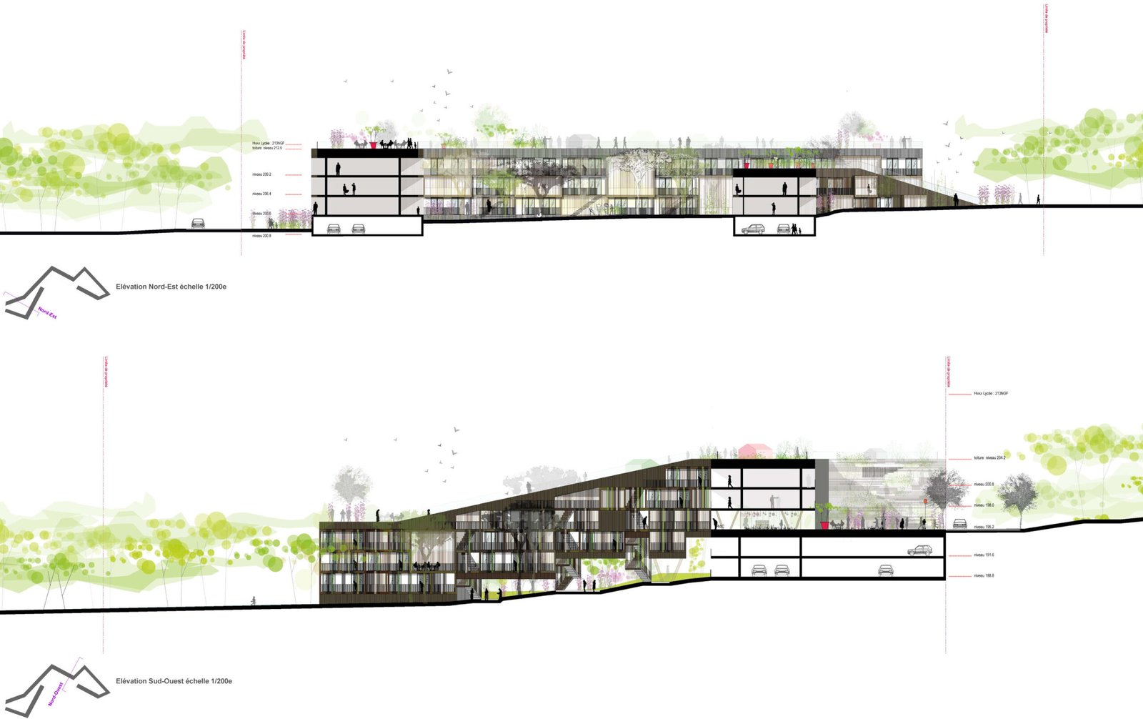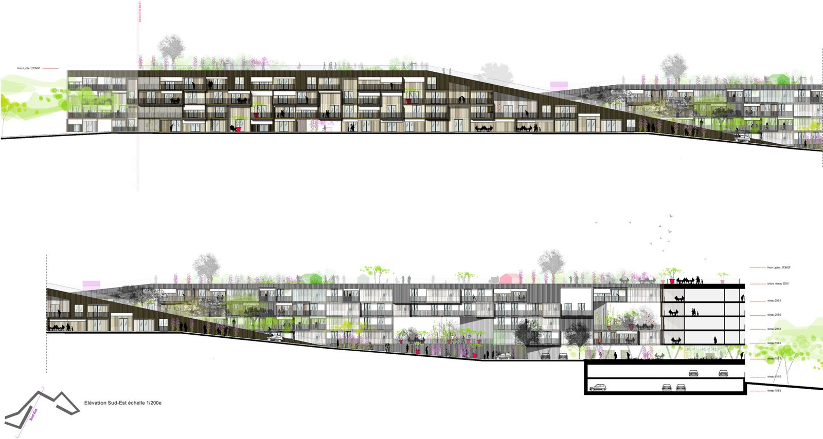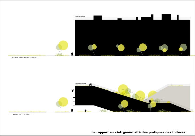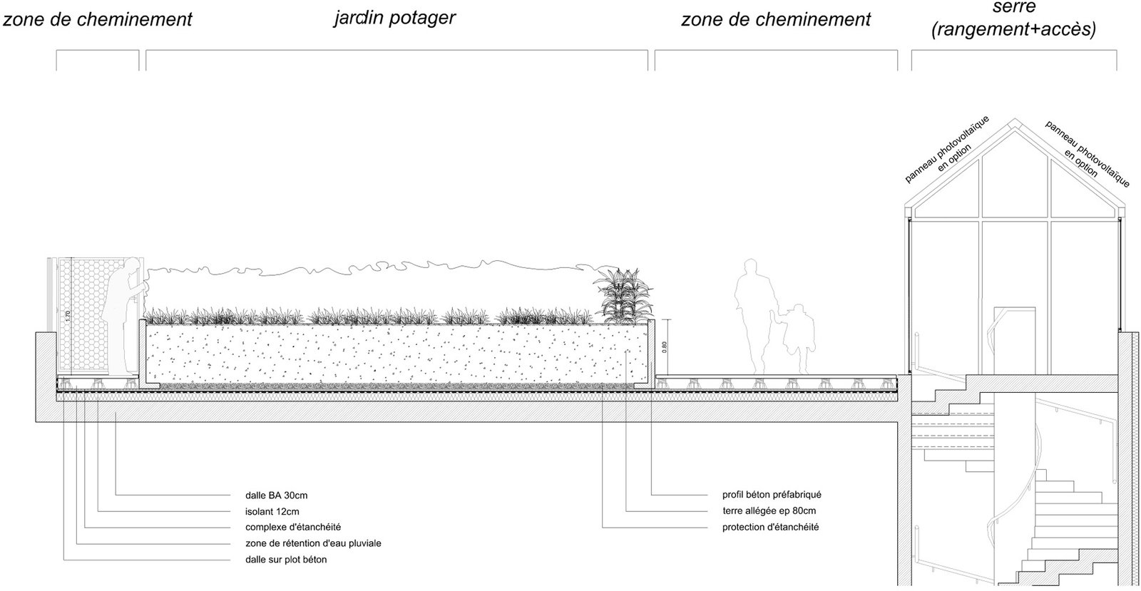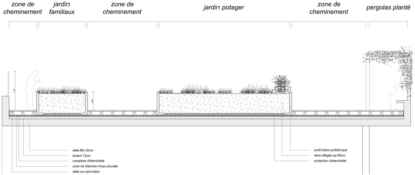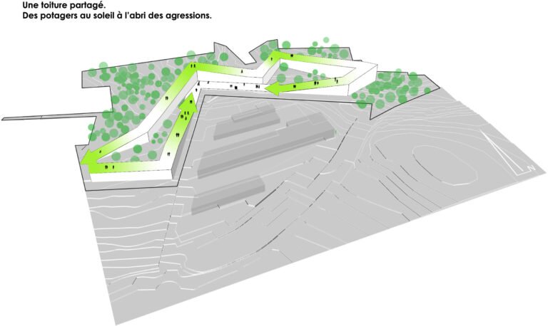 Les jardins partagés des toits terrasses sont un lieu de vie et d’échange dédié au jardin, un belvédère et une promenade au-dessus des arbres, ouvert sur le grand paysage.