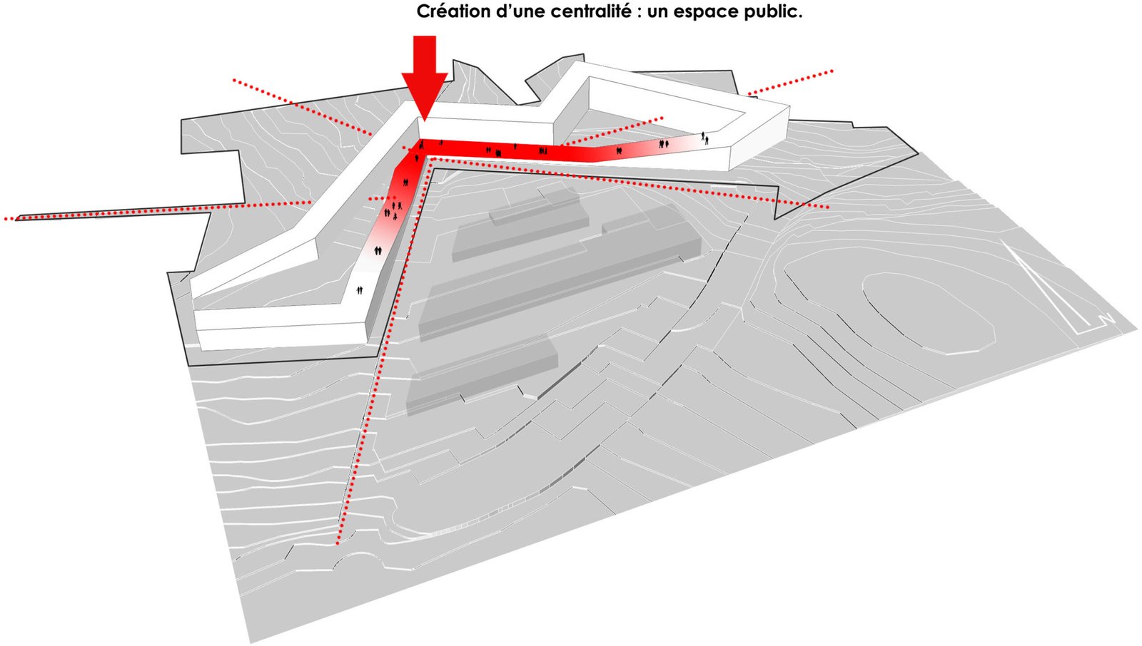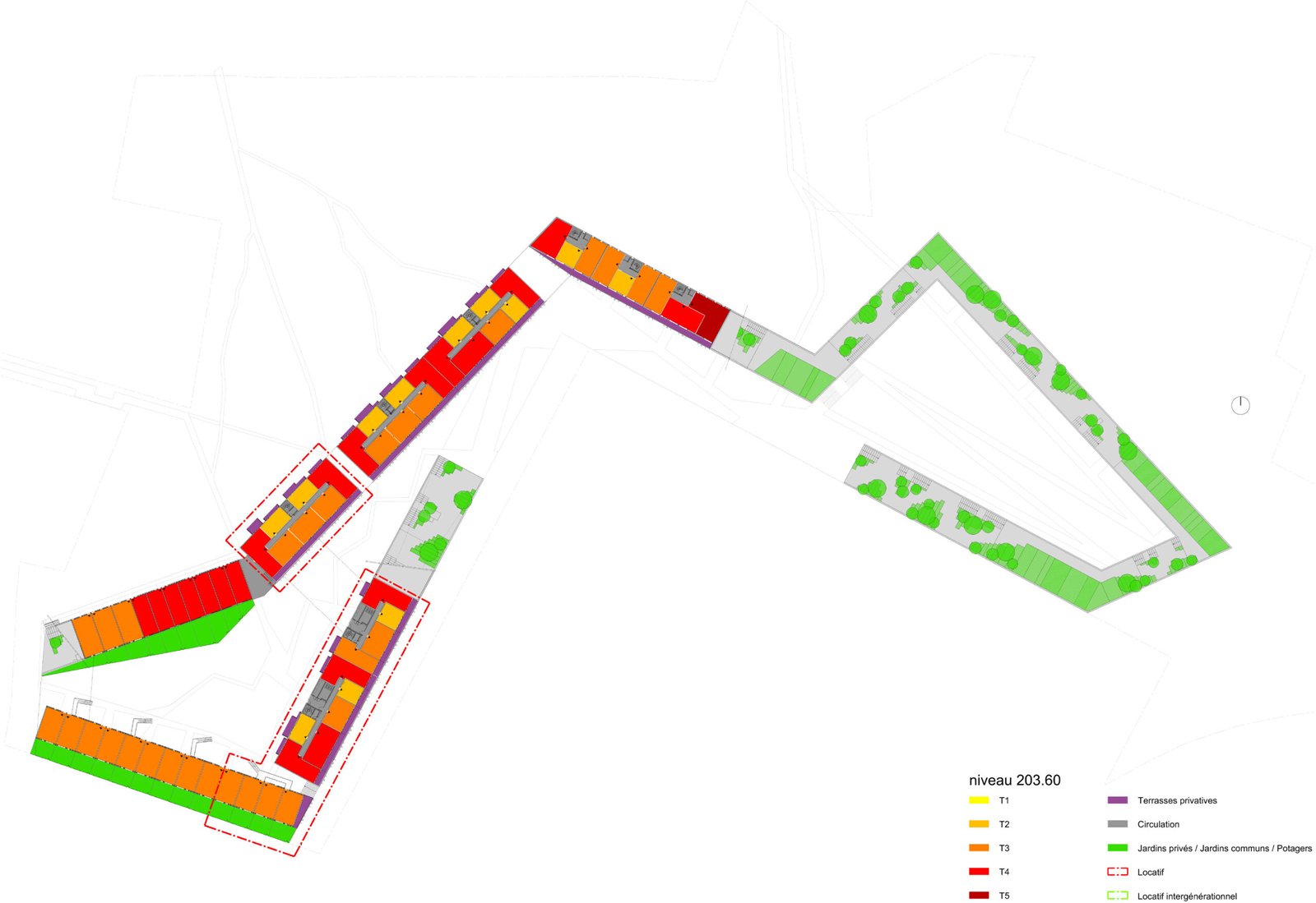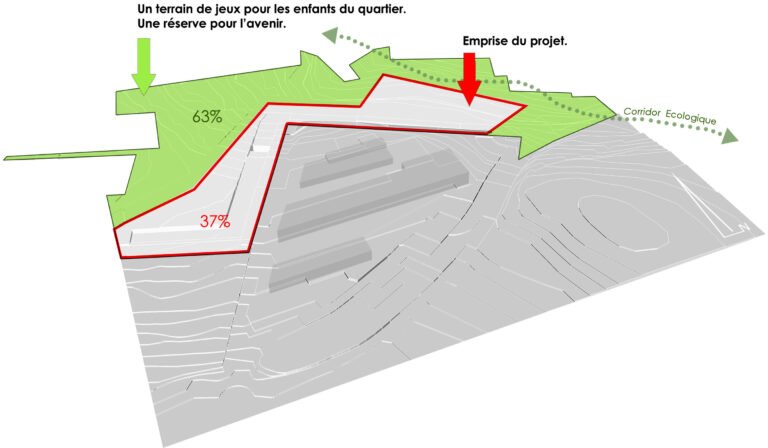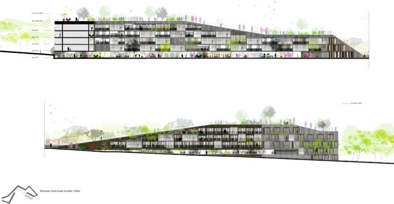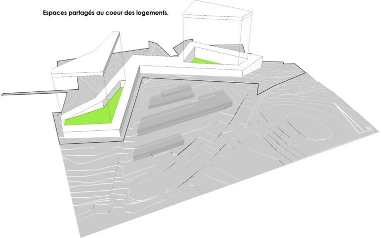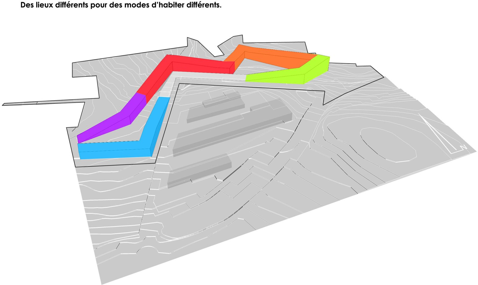 L’implantation sur le site, liée à la topographie et à la hauteur maximale imposée nous per- met de développer plusieurs typologies suivant l’orientation, la configuration des bâtiments et leur position dans le paysage.