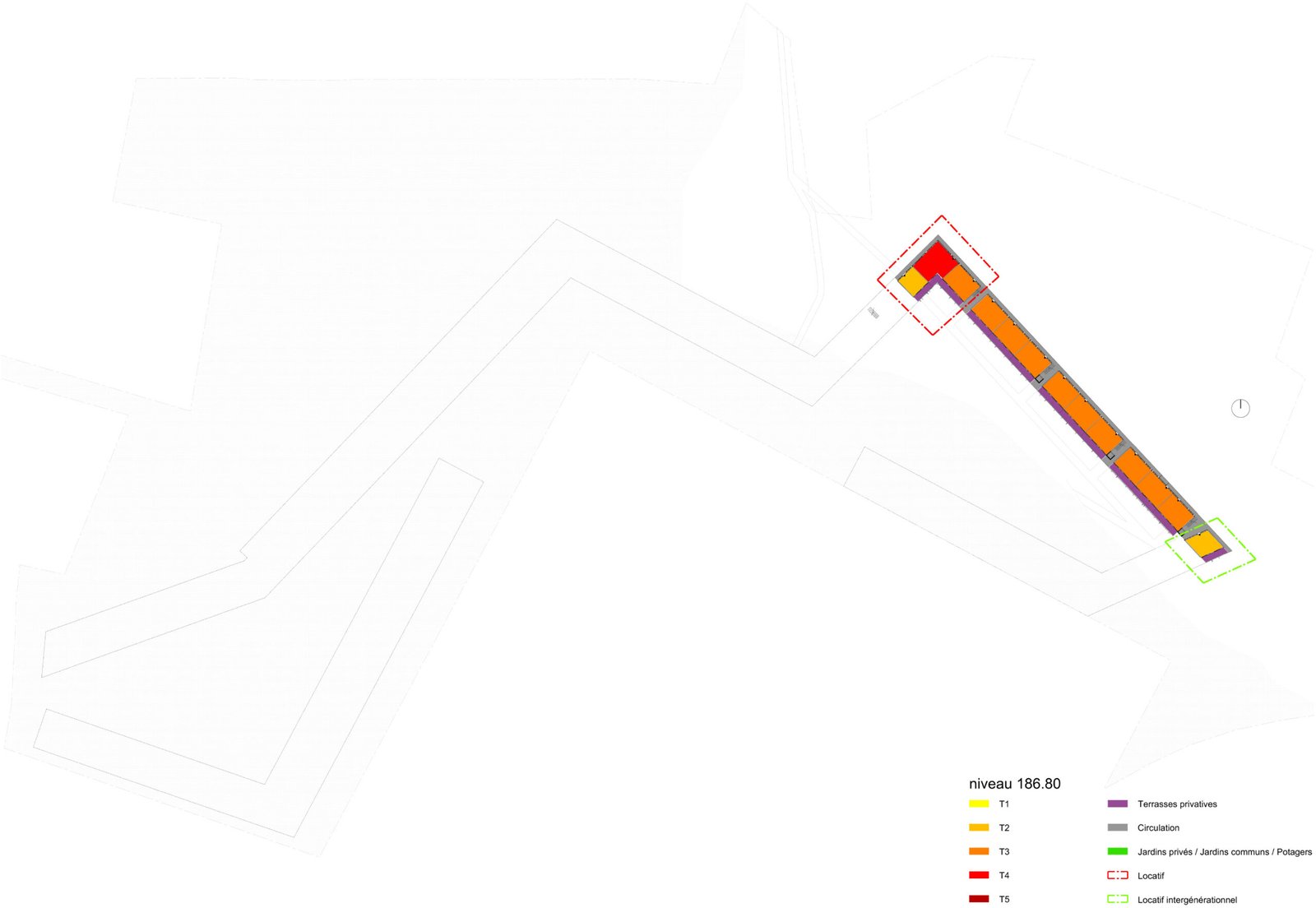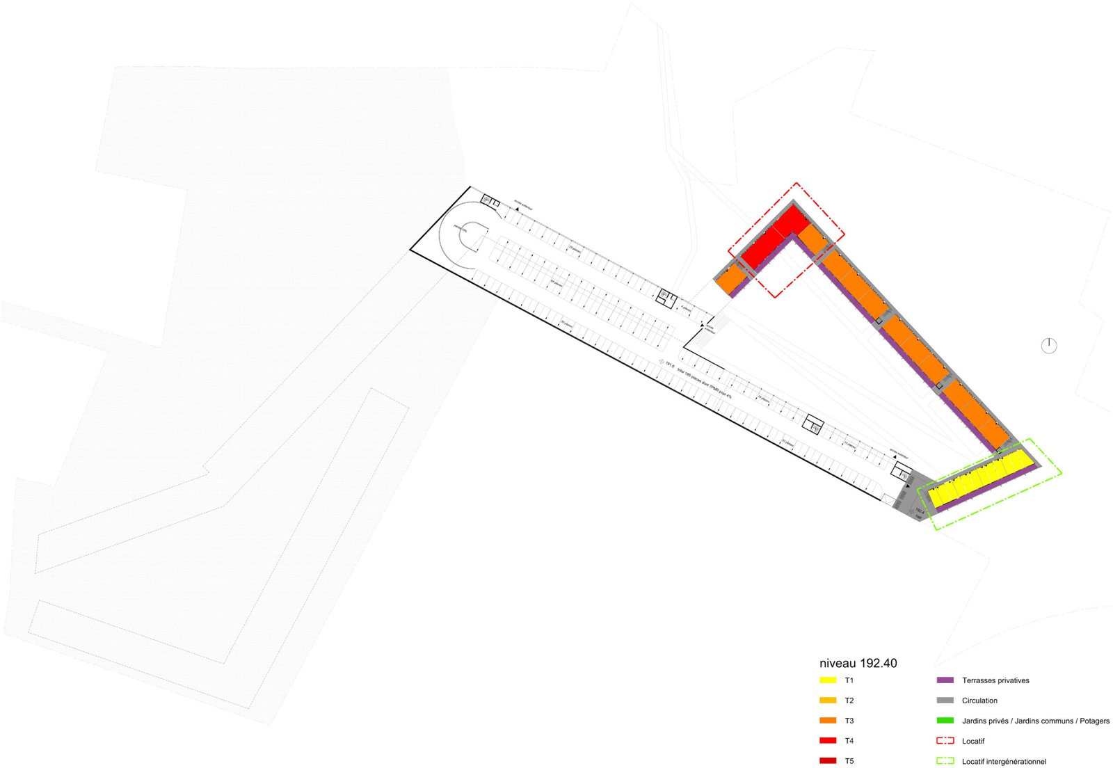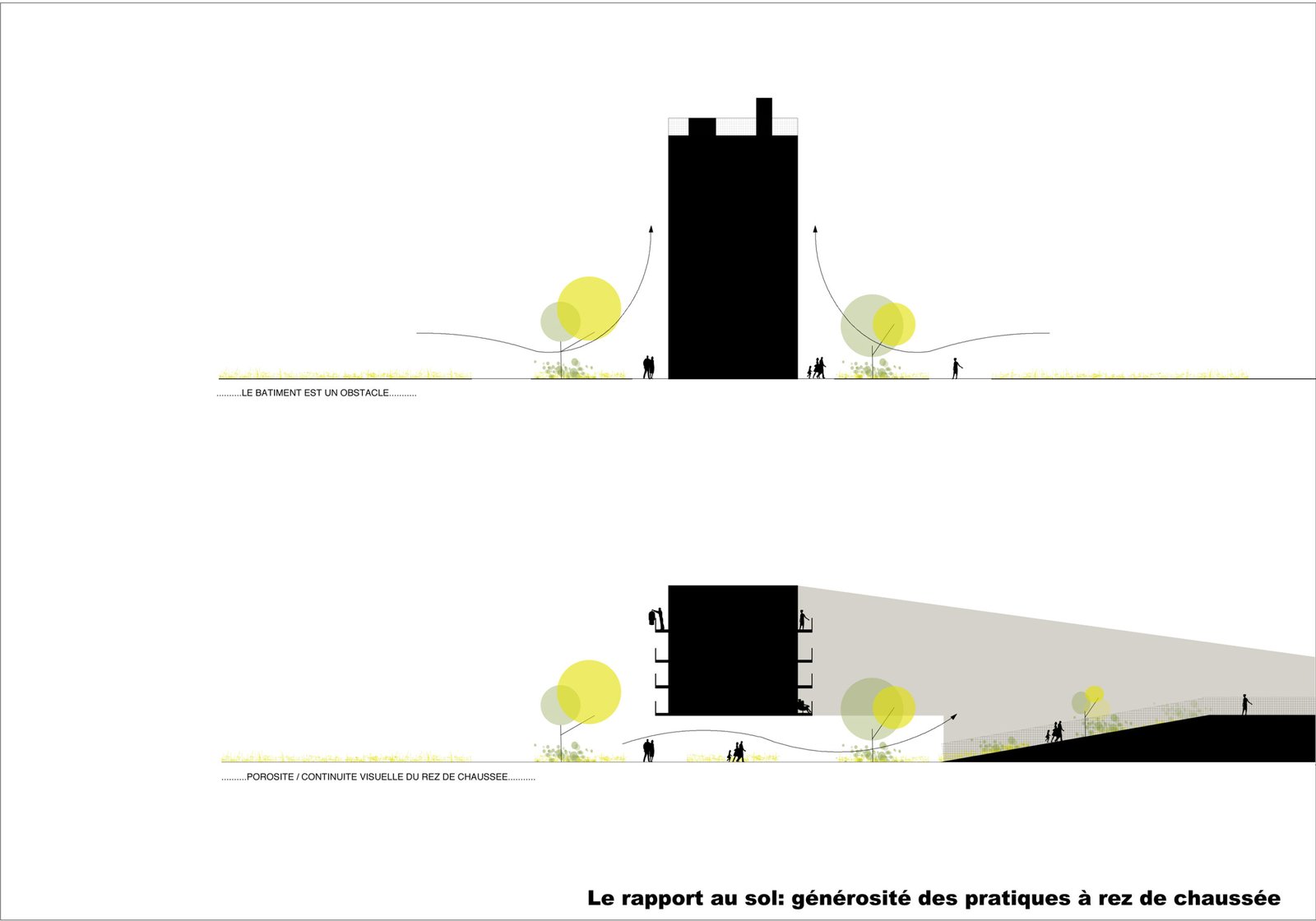 L’implantation sur le site, liée à la topographie et à la hauteur maximale imposée nous per- met de développer plusieurs typologies suivant l’orientation, la configuration des bâtiments et leur position dans le paysage.