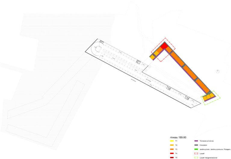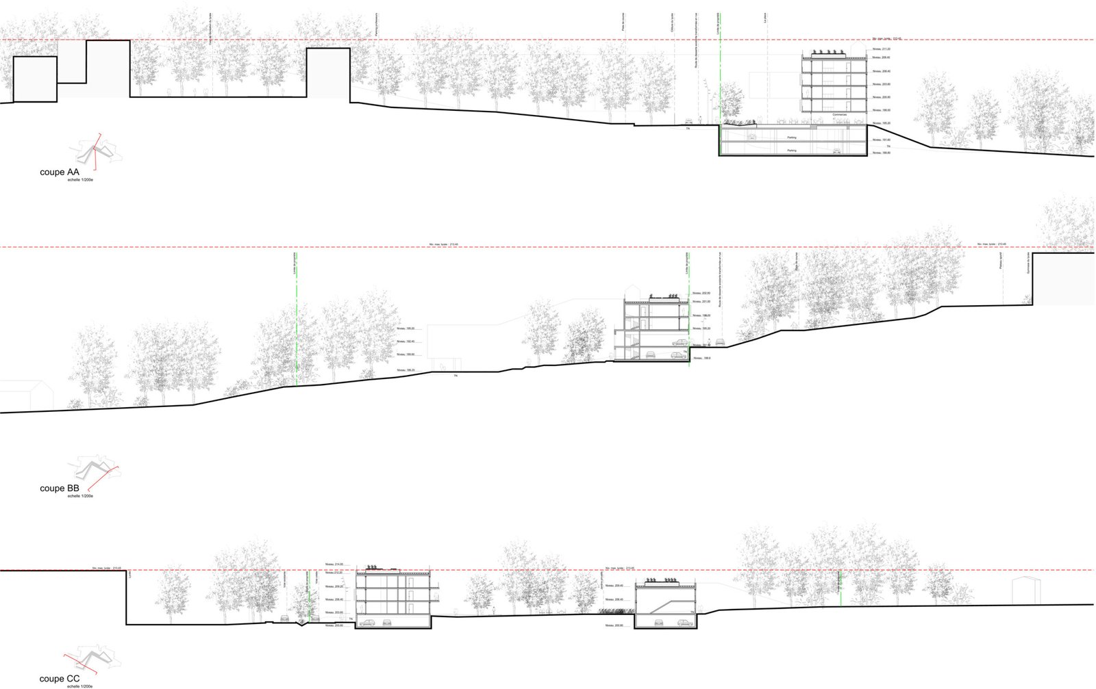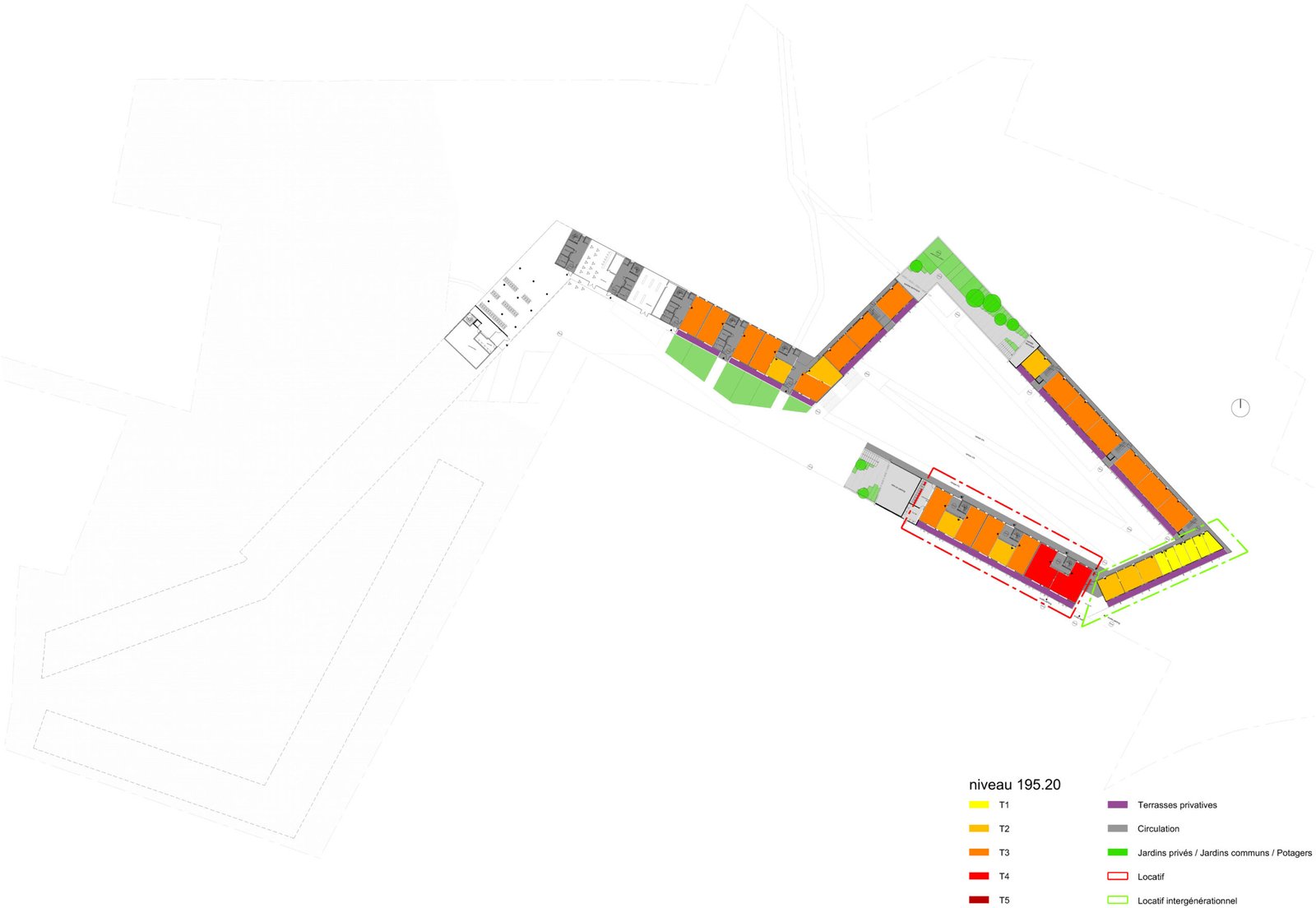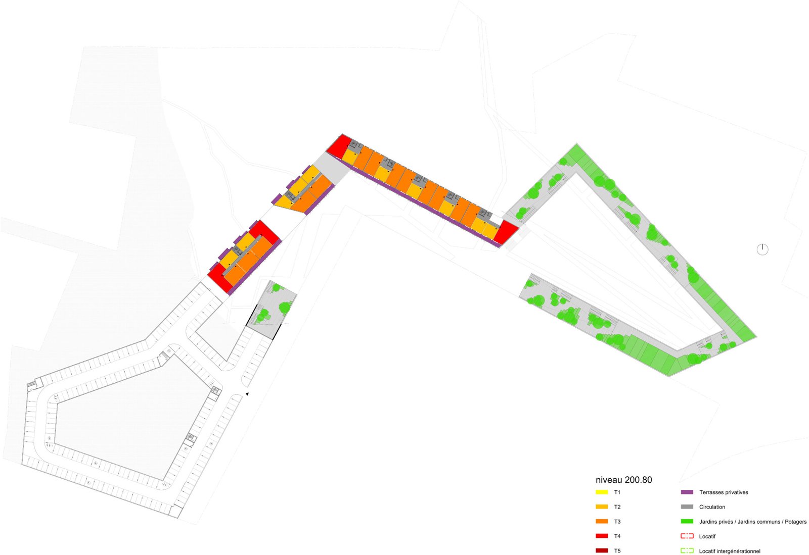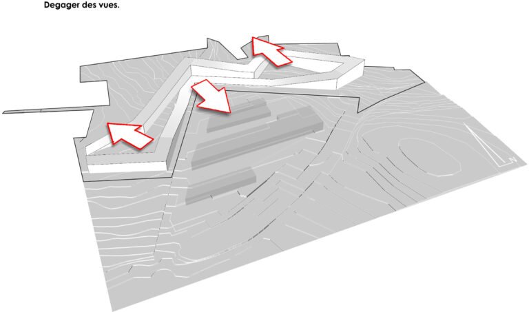 L’implantation sur le site, liée à la topographie et à la hauteur maximale imposée nous per- met de développer plusieurs typologies suivant l’orientation, la configuration des bâtiments et leur position dans le paysage.