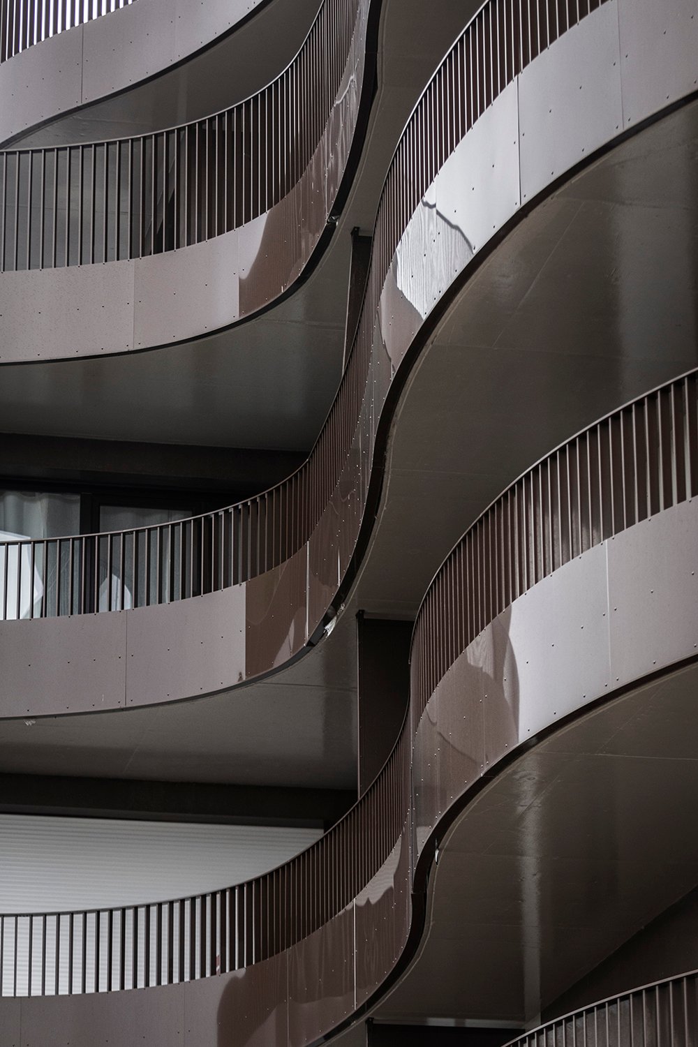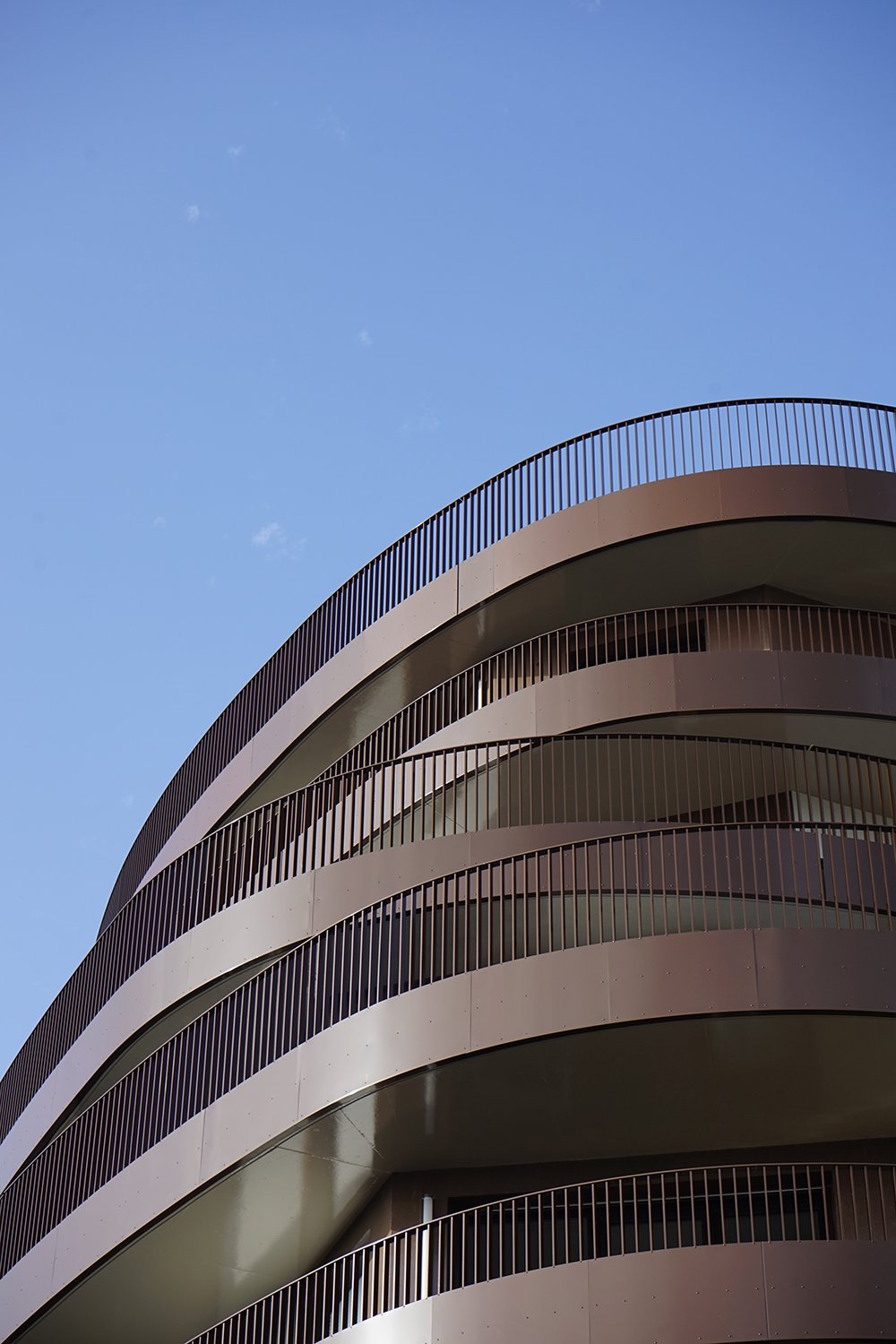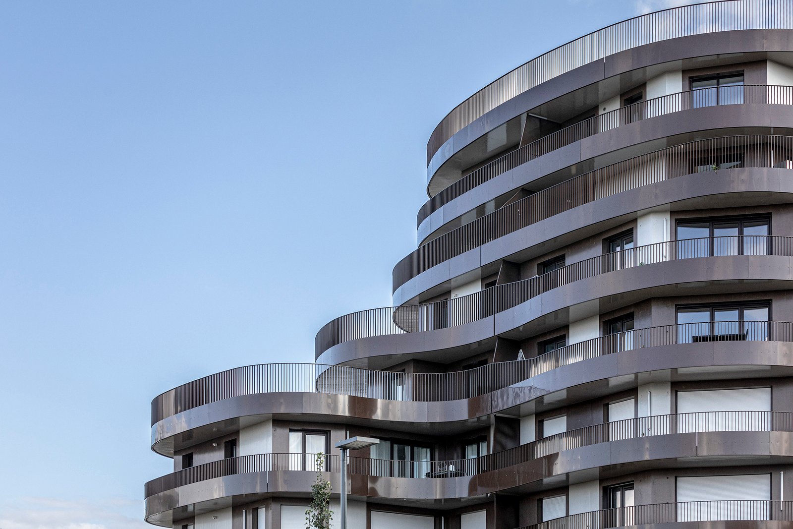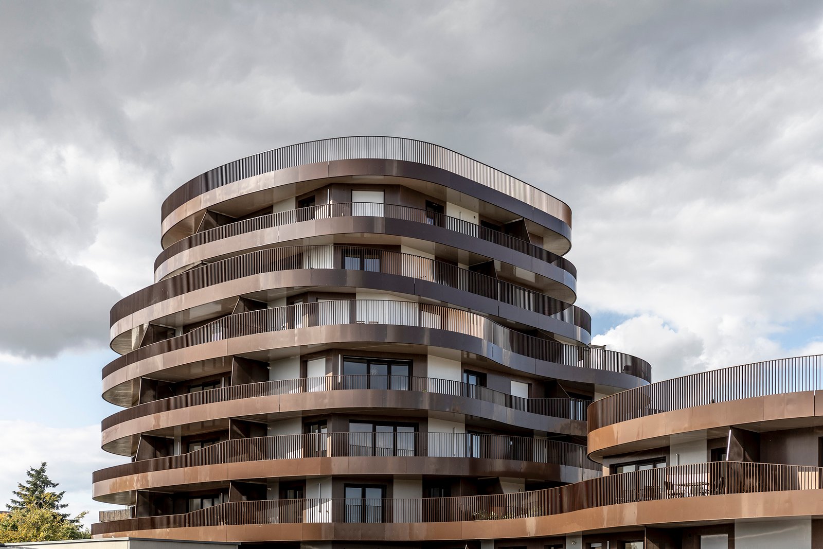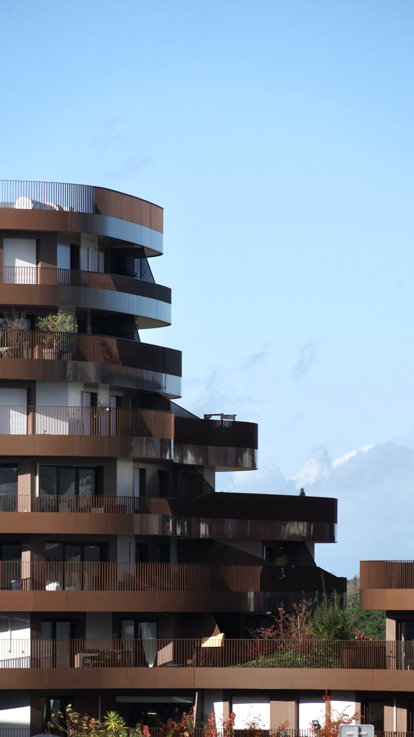 Tout en courbe et en balcons filants, le bâtiment se démarque des constructions voisines, créant une ponctuation et une respiration dans le lotissement.