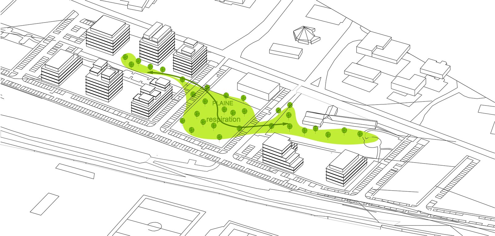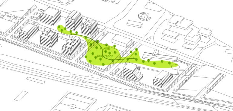 Le projet s’inscrit dans la continuité urbaine du boulevard du belvédère et paysagère du lotissement (parc et traversée verte).