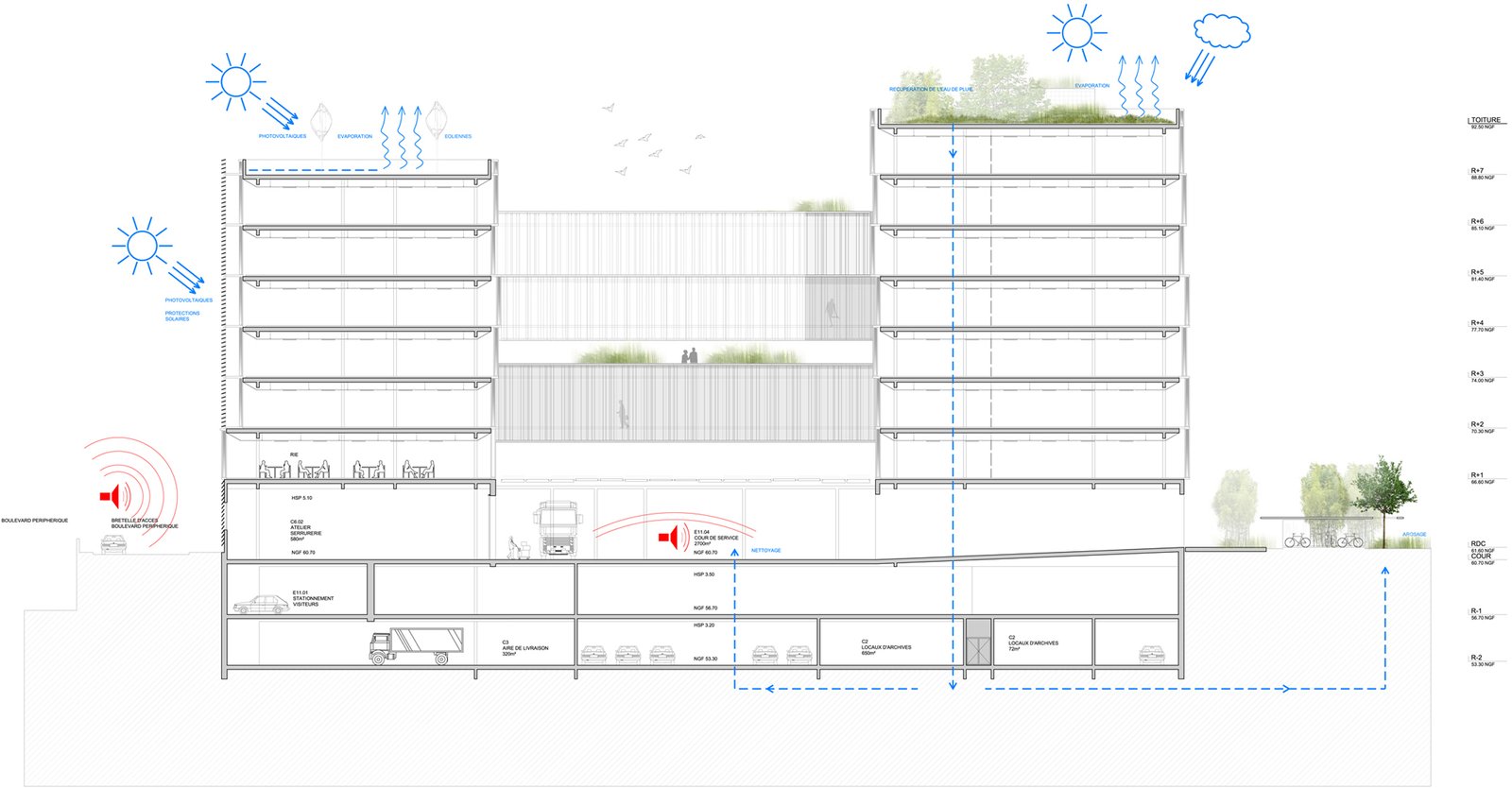 Lieu de transition entre Paris et Ivry, ce projet mixte est fédéré par une large percée visuelle qui finit en belvédère sur la ville.
