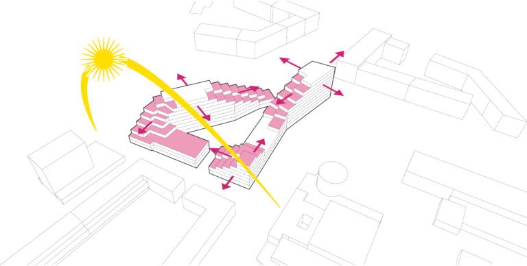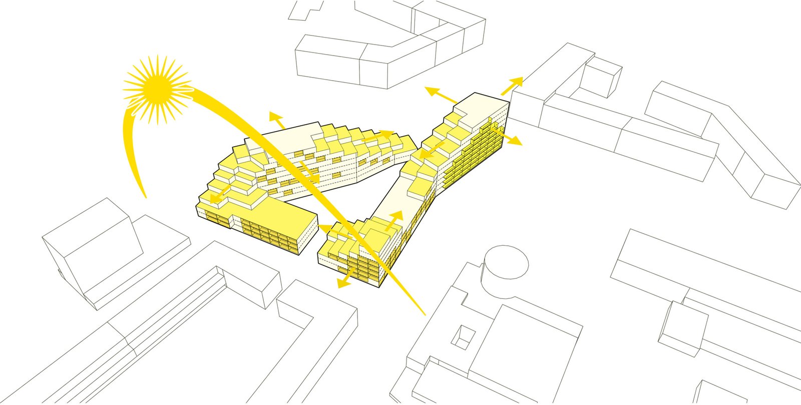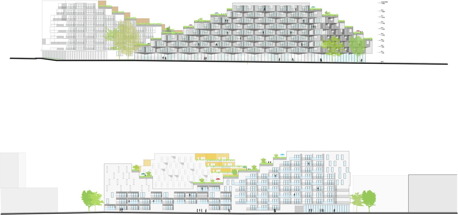La forme urbaine répond à plusieurs exigences contextuelles et environnementales, dont l’une des plus importantes est l’orientation solaire, celle-ci concordant ici avec des vues dégagées. L’ensemble est constitué par une succession de terrasses en gradin dont les retraits permettent la pénétration du soleil à l’intérieur de l’îlot. Il résulte de ce travail sur la forme un ensemble sculpté en fonction d’exigences environnementales qui participent à une recherche de diversité.