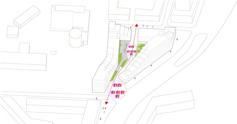 L’espace public regroupe à la fois les accès aux logements et le passage vers une promenade existante.