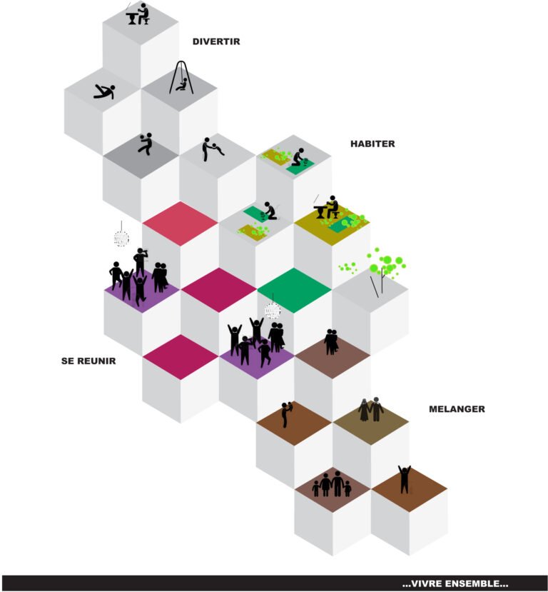 Symbole d’un nouvel hédonisme urbain, ce projet offre un enchaînement de terrasses, une véritable cascade de jardins suspendus. Il incarne les aspirations des citadins à avoir leur propre espace extérieur, leur « sol personnel », réminiscence lointaine à la maison individuelle. Ce projet initie une nouvelle manière de vivre ensemble basée essentiellement sur la générosité des espaces extérieurs privatifs et collectifs.