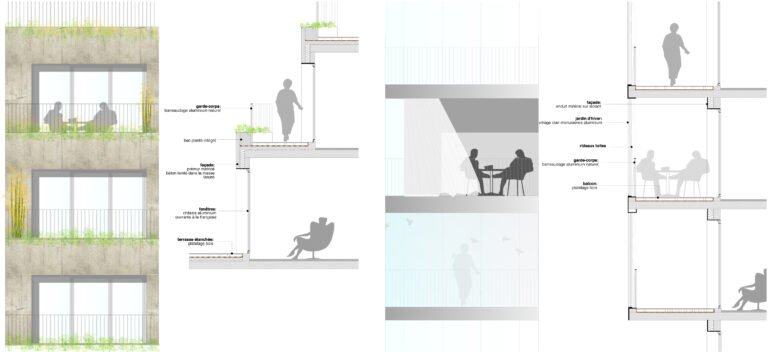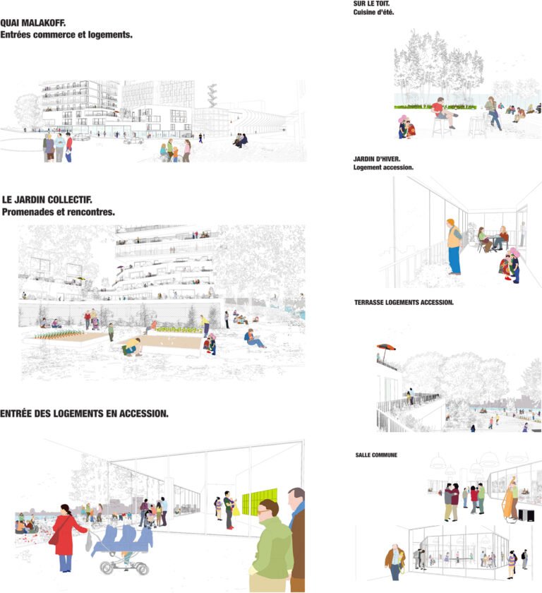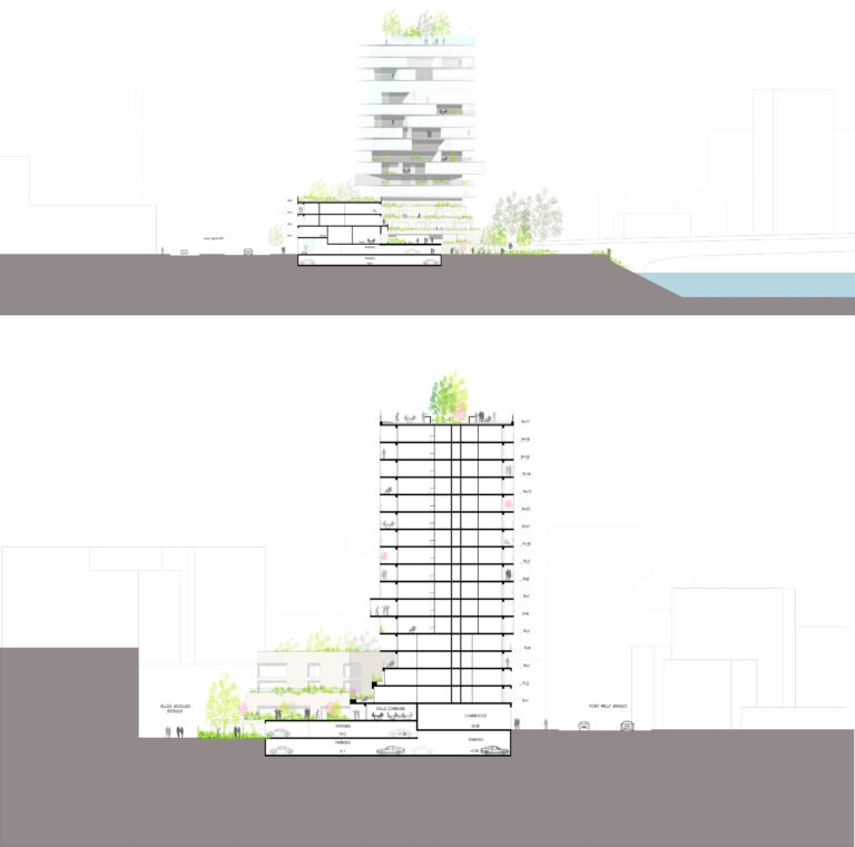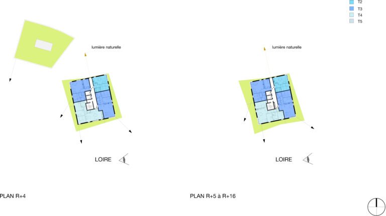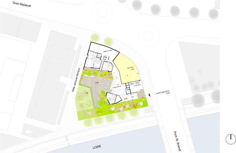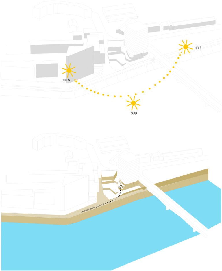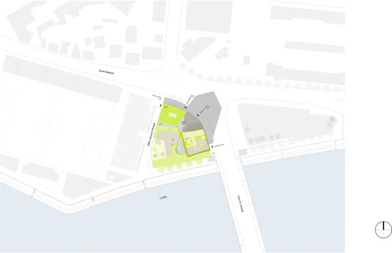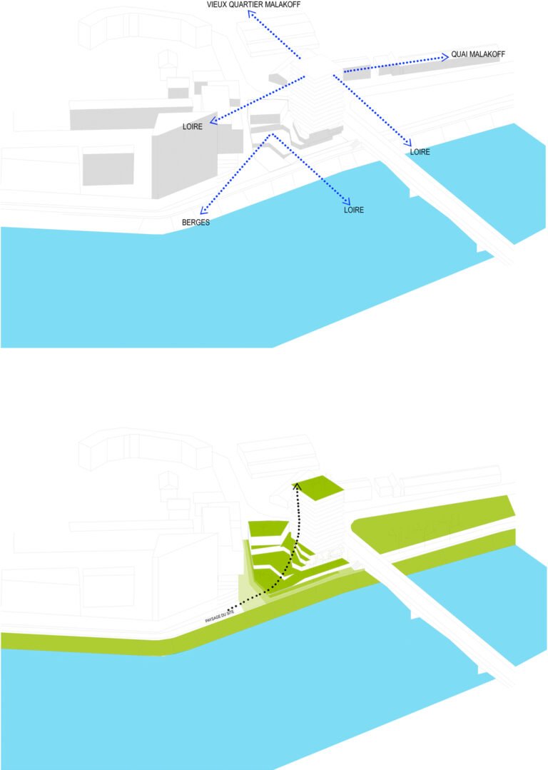 Dans ce projet, cette idée s’exprime par une position de tension entre le site et le bâti. Une relation qui fait naître une émotion forte. Cette relation trouve son expression formelle dans une ascension progressive. Le bâtiment mute, se transforme dans son parcours de la terre vers le ciel. Constitué de béton teinté dans la masse, la base joue le rôle d’interface, de transition entre le sol naturel et le bâtiment. Prolongement naturel des berges de la Loire notre bâtiment accueille en son sein la biodiversité alentour dans une continuité biotopique symbolisée et mise en scène par les pratiques collectives et de partage qui s’y regroupent. Ce choix d’accompagner la promenade sur berge dans notre bâtiment est dicté par cette volonté forte de démarrer le bâtiment par un ancrage dans le sol et dans l’espace public.