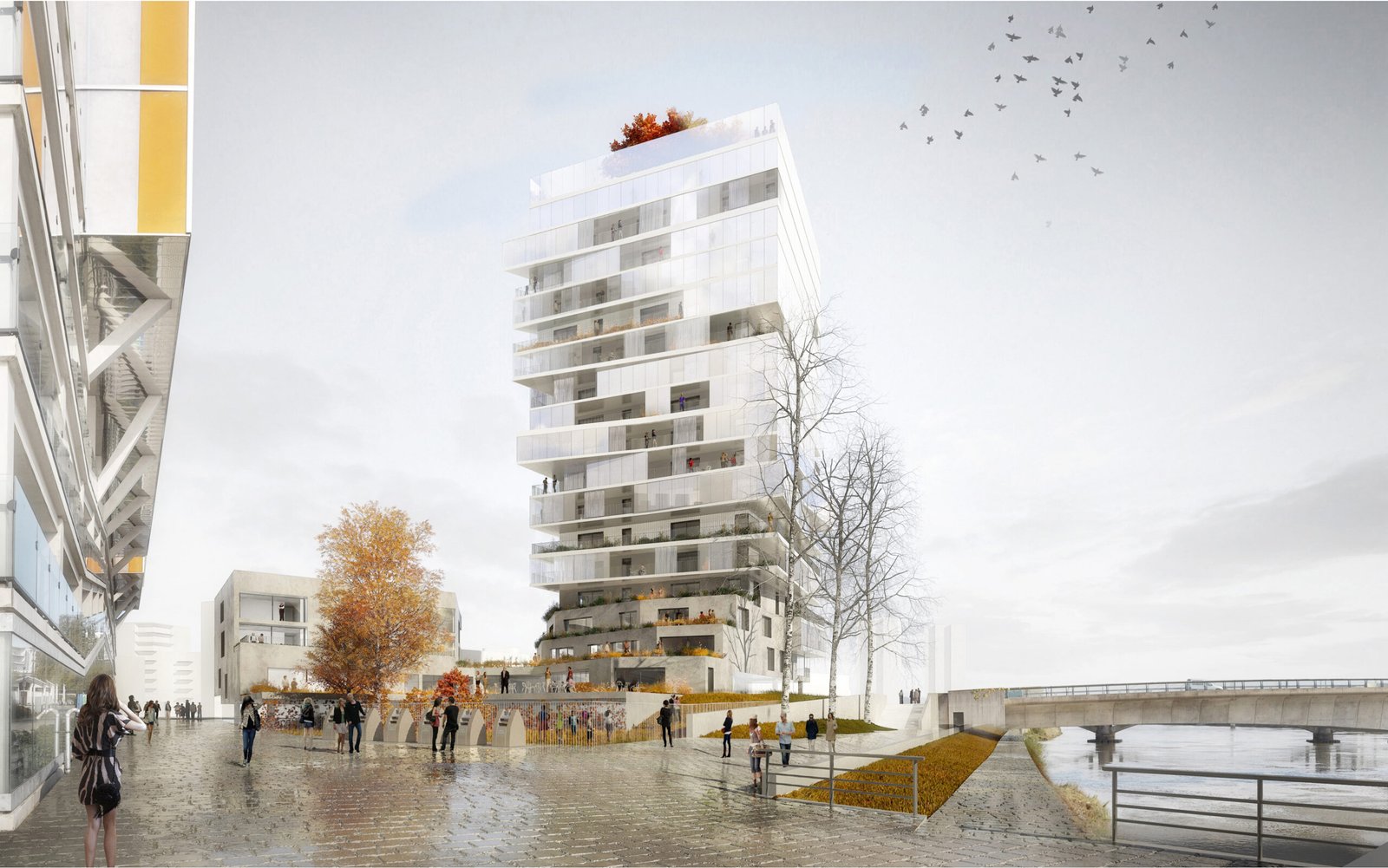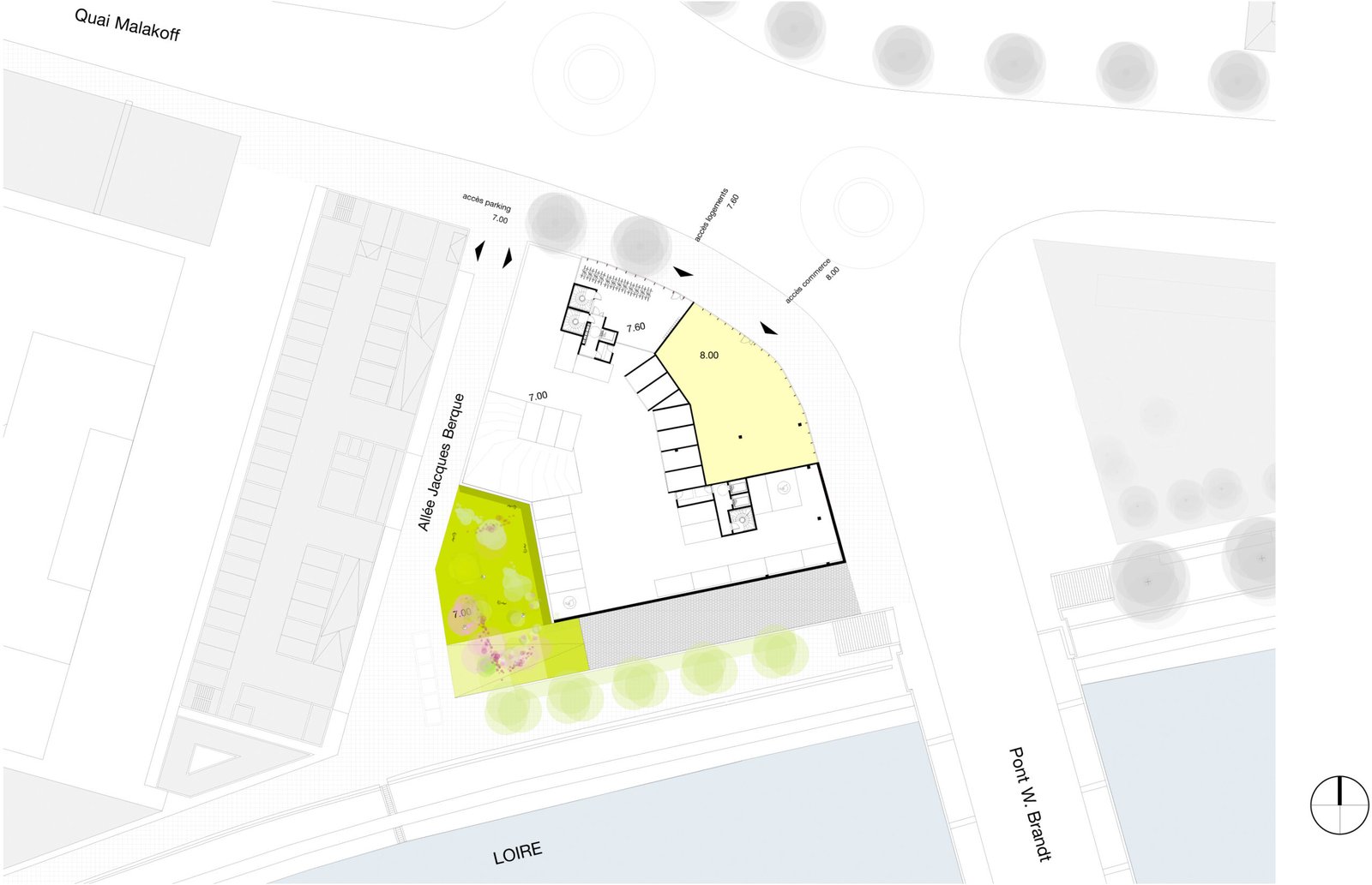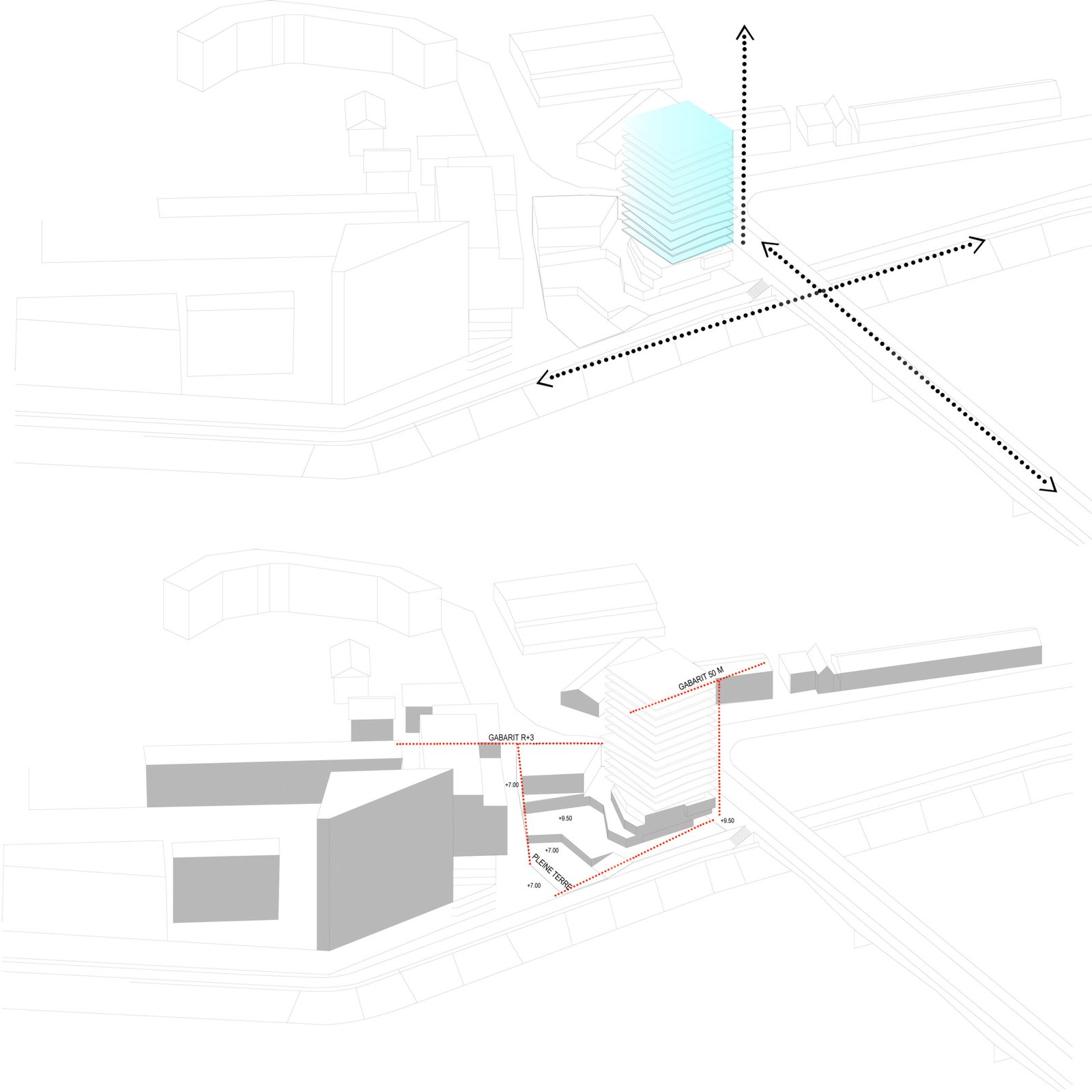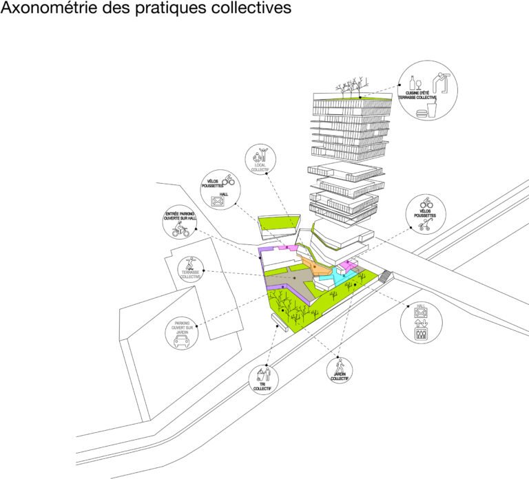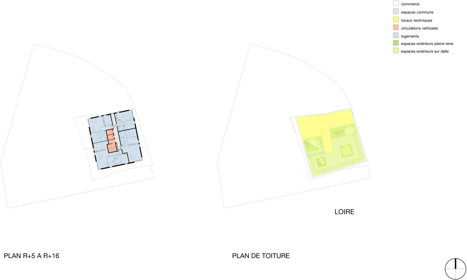Dans ce projet, cette idée s’exprime par une position de tension entre le site et le bâti. Une relation qui fait naître une émotion forte. Cette relation trouve son expression formelle dans une ascension progressive. Le bâtiment mute, se transforme dans son parcours de la terre vers le ciel. Constitué de béton teinté dans la masse, la base joue le rôle d’interface, de transition entre le sol naturel et le bâtiment. Prolongement naturel des berges de la Loire notre bâtiment accueille en son sein la biodiversité alentour dans une continuité biotopique symbolisée et mise en scène par les pratiques collectives et de partage qui s’y regroupent. Ce choix d’accompagner la promenade sur berge dans notre bâtiment est dicté par cette volonté forte de démarrer le bâtiment par un ancrage dans le sol et dans l’espace public.
