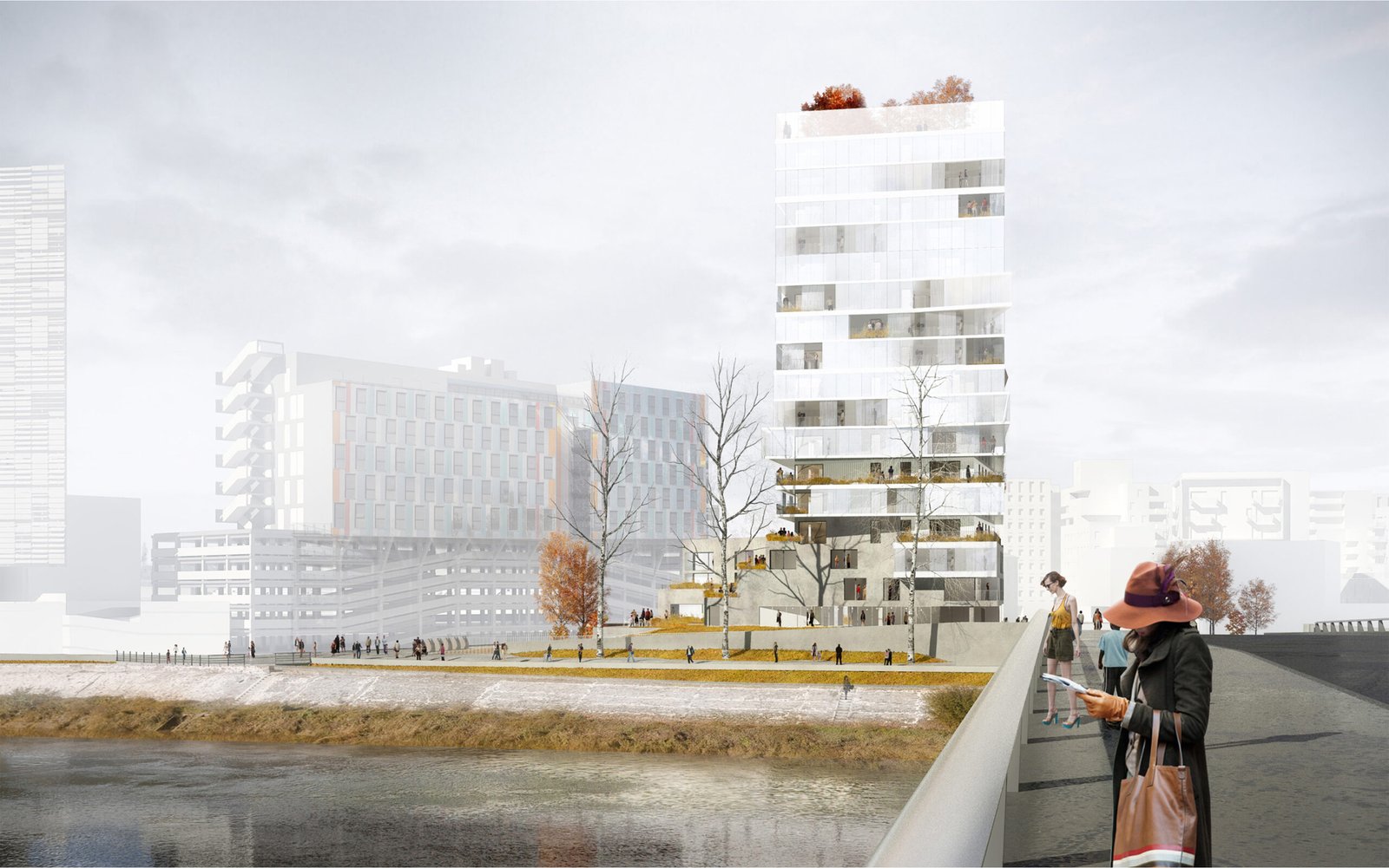 Symbole du paysage constitutif de ce lieu ; notre bâtiment sera perçu non pas comme une architecture supplémentaire mais comme un morceau de paysage, gardien des berges et lien entre les deux rives. Les limites en deviennent flous, paysage et construction entre en résonnance. Nous sommes finalement plus dans une attitude de paysage, de perception globale que dans une attitude démonstrative. C’est cet équilibre entre la fonctionnalité, la recherche d’une performance spatiale et en même temps un décalage suffisant, bien dosé qui fait que ce projet sera unique. C’est là que se situe l’architecture.