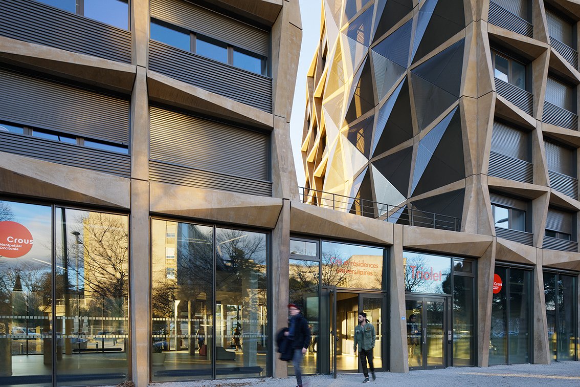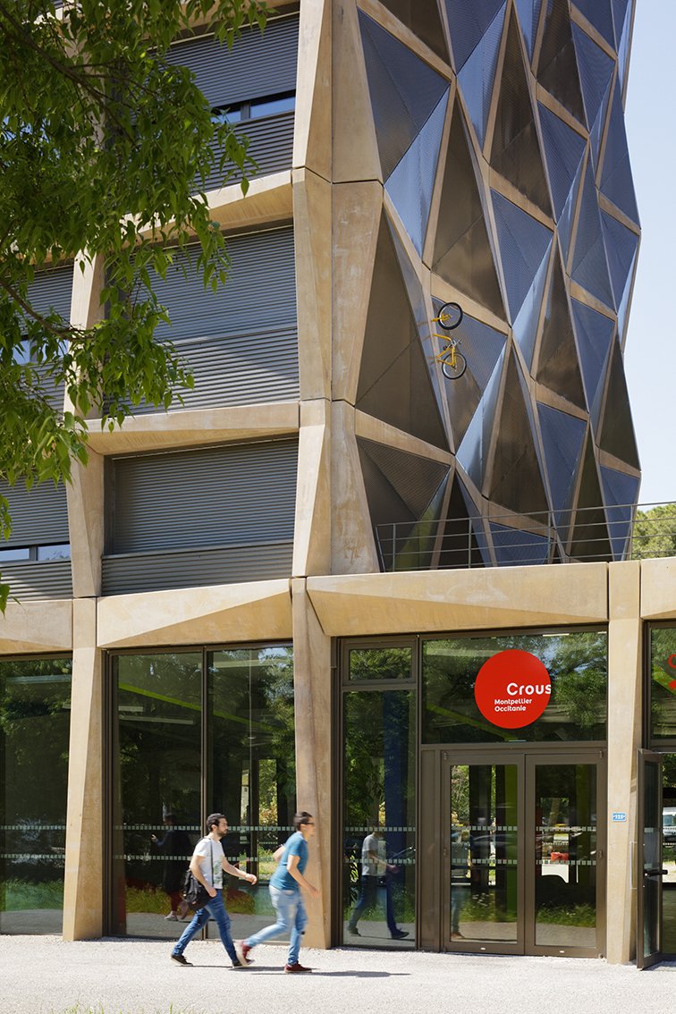 Le projet intègre la participation d’artistes avec des œuvres installées au sein et sur les façades du bâtiment, les interventions ont été conduites par l’association de street art « Line Up » pour le Crous de Montpellier – Occitanie. Les artistes Zest et BMX ont été invités à intégrer des installations artistiques dans la résidence étudiante, Zest s’est vue confier une intervention dans le hall d’entrée et a conçu une œuvre immersive constituée des séquences chromatiques qui dialoguent avec l’architecture et la matérialité en béton brut du grand hall de la résidence.