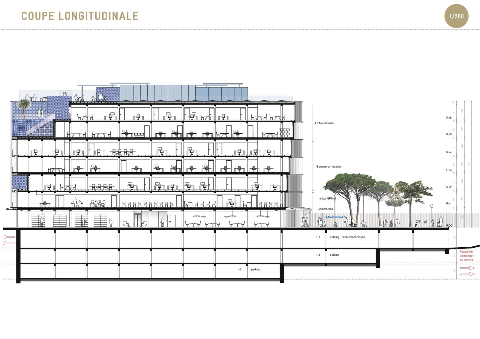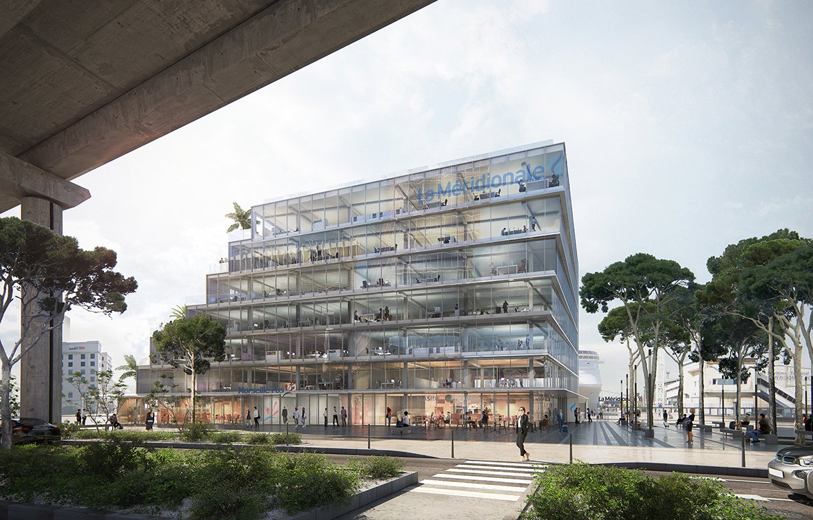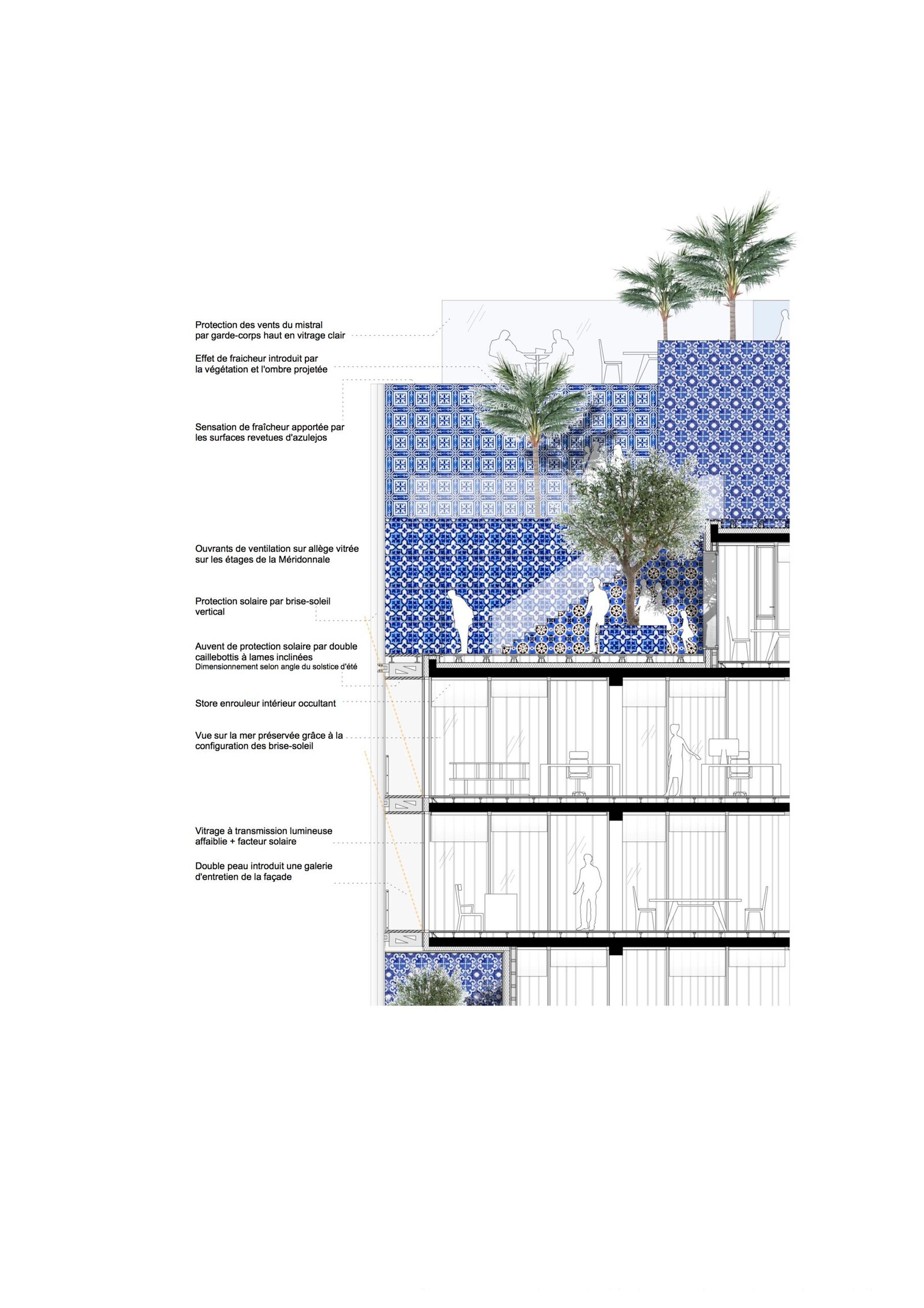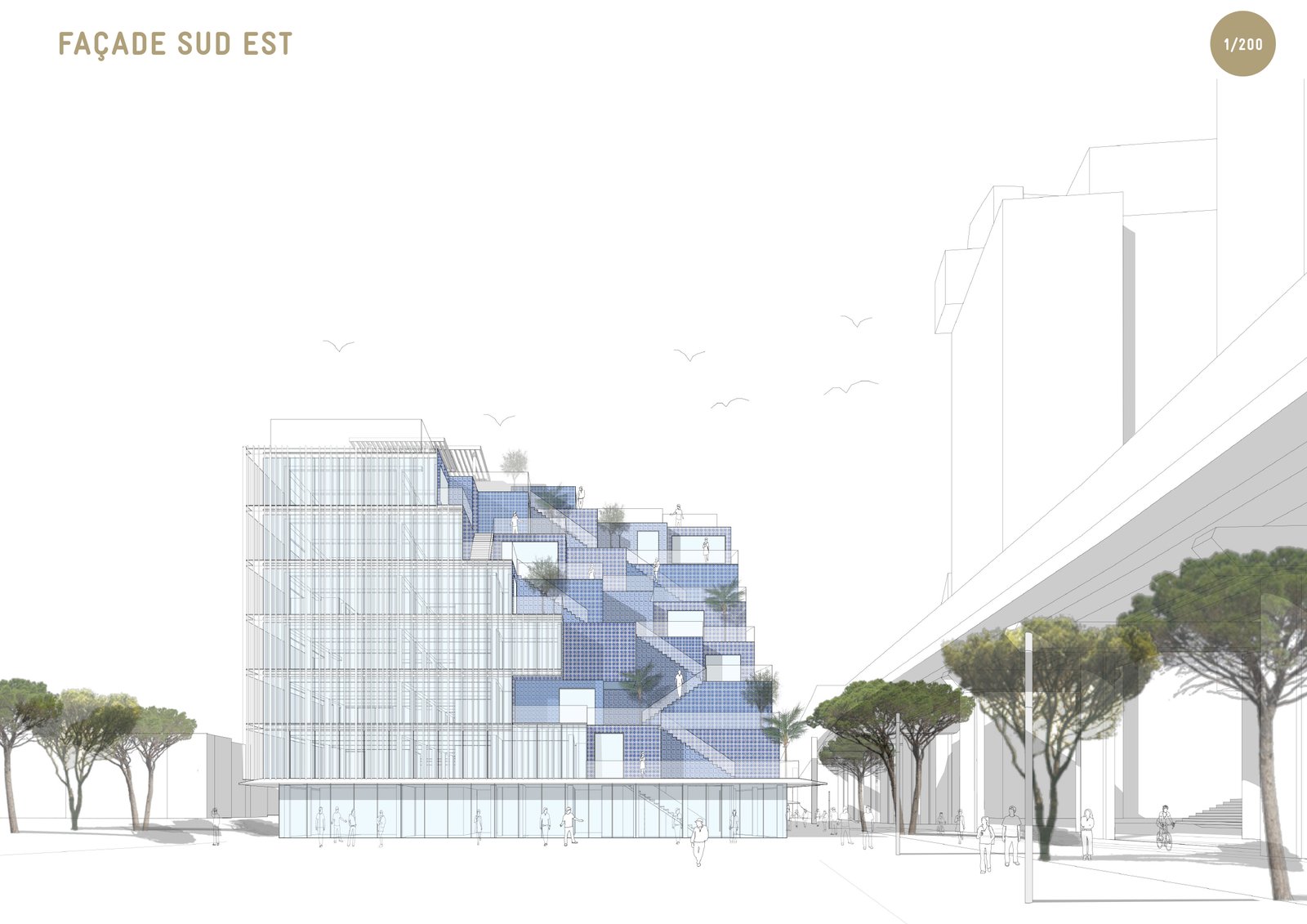 Lire la suite : Siège de la MéridionaleNotre projet va raconter cette histoire sudiste, ses références topographiques, sa matérialité qui alterne la clarté du vitrage avec les motifs méditerranéens des azulejos à dominante de bleus. Ce projet de bureaux n’est pas un immeuble tertiaire de plus dans le territoire de nos villes, c’est un bâtiment qui va mettre en scène la richesse de Marseille et son identité méditerranéenne.