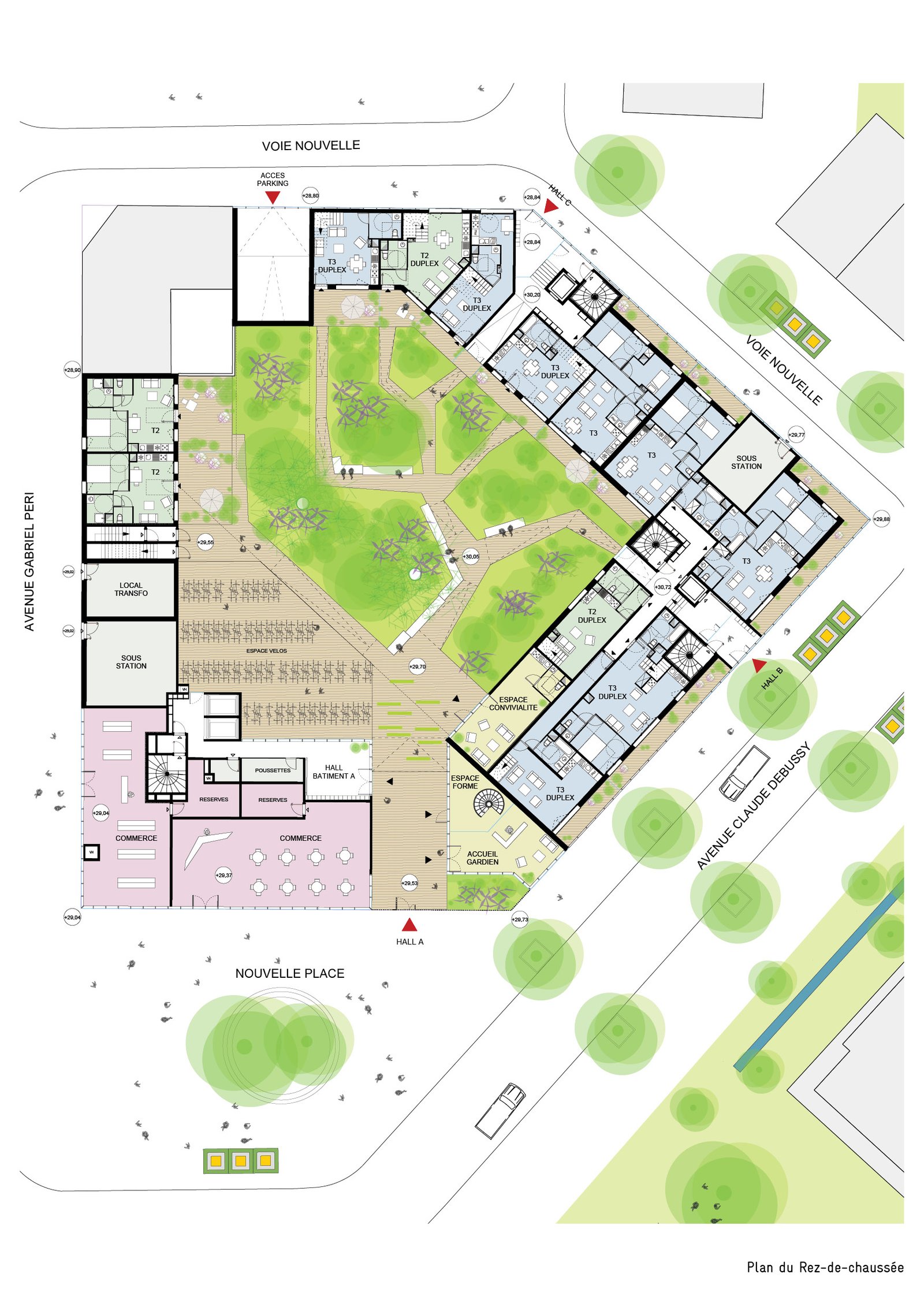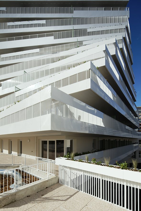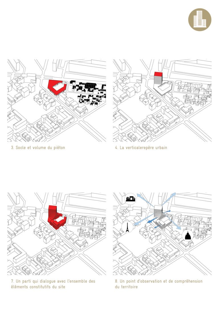 La volumétrie du bâtiment accompagne les différentes échelles dans un jeu d’épannelage et d’éventail. La mise en place de ces paliers intermédiaires permet de séquencer le volume. Les commerces, les porches, les halls, autant de percées visuelles à rez-de-chaussée qui accompagnent le « volume du piéton ».