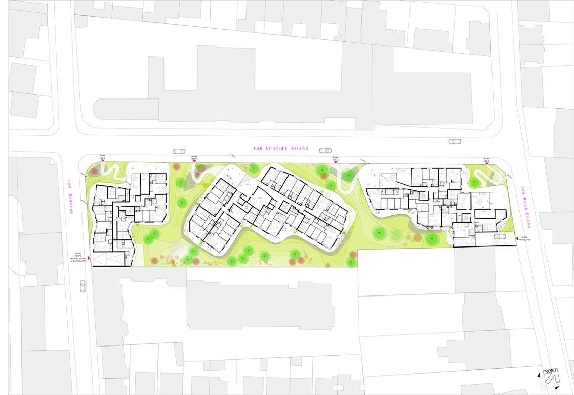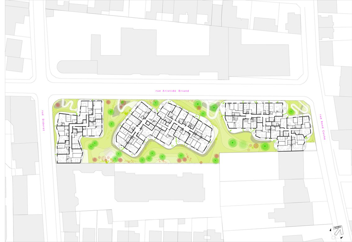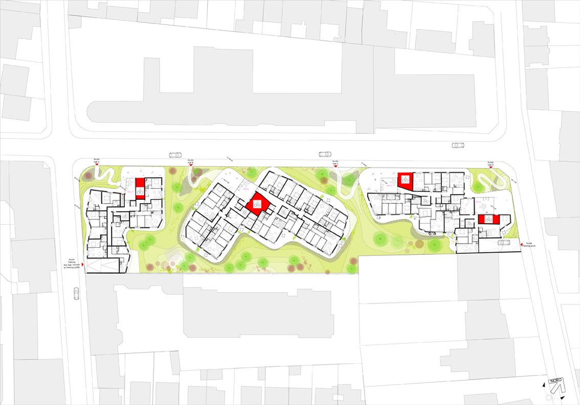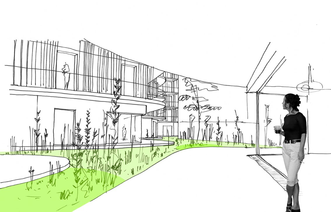 Nous avons imaginé une constellation de bâtiments articulés, ouvrant un dialogue avec l’environnement, basé sur le vaste espace extérieur privé et collectif.